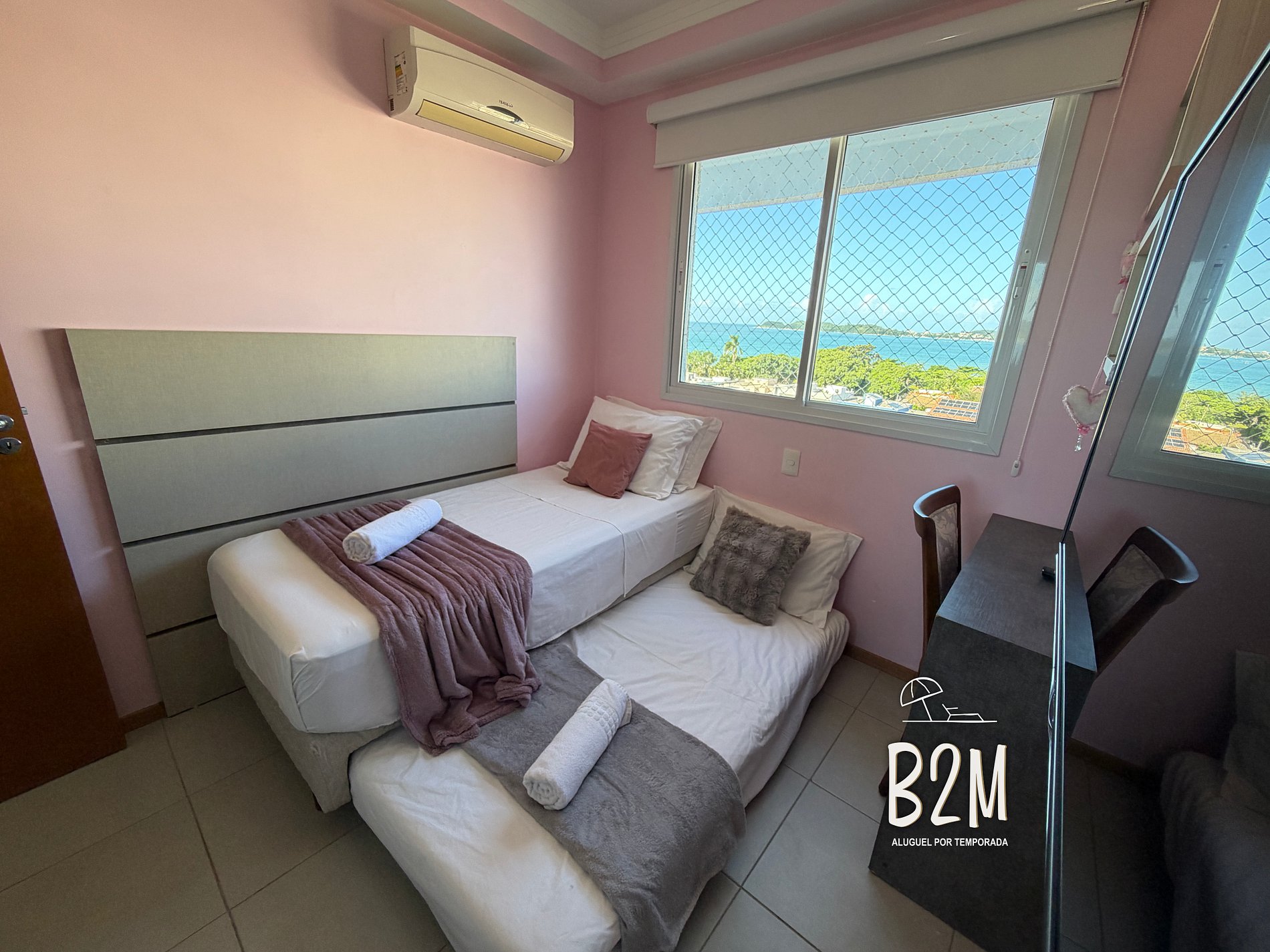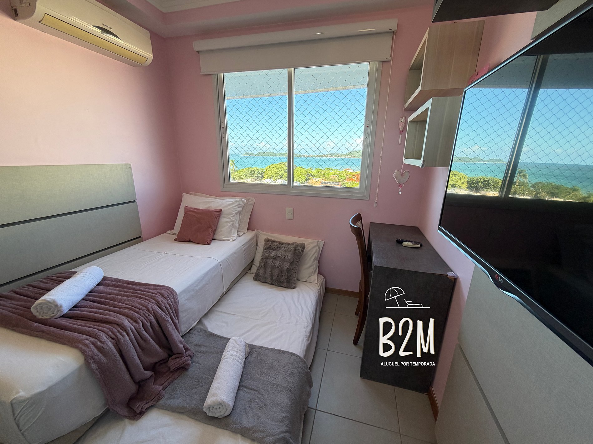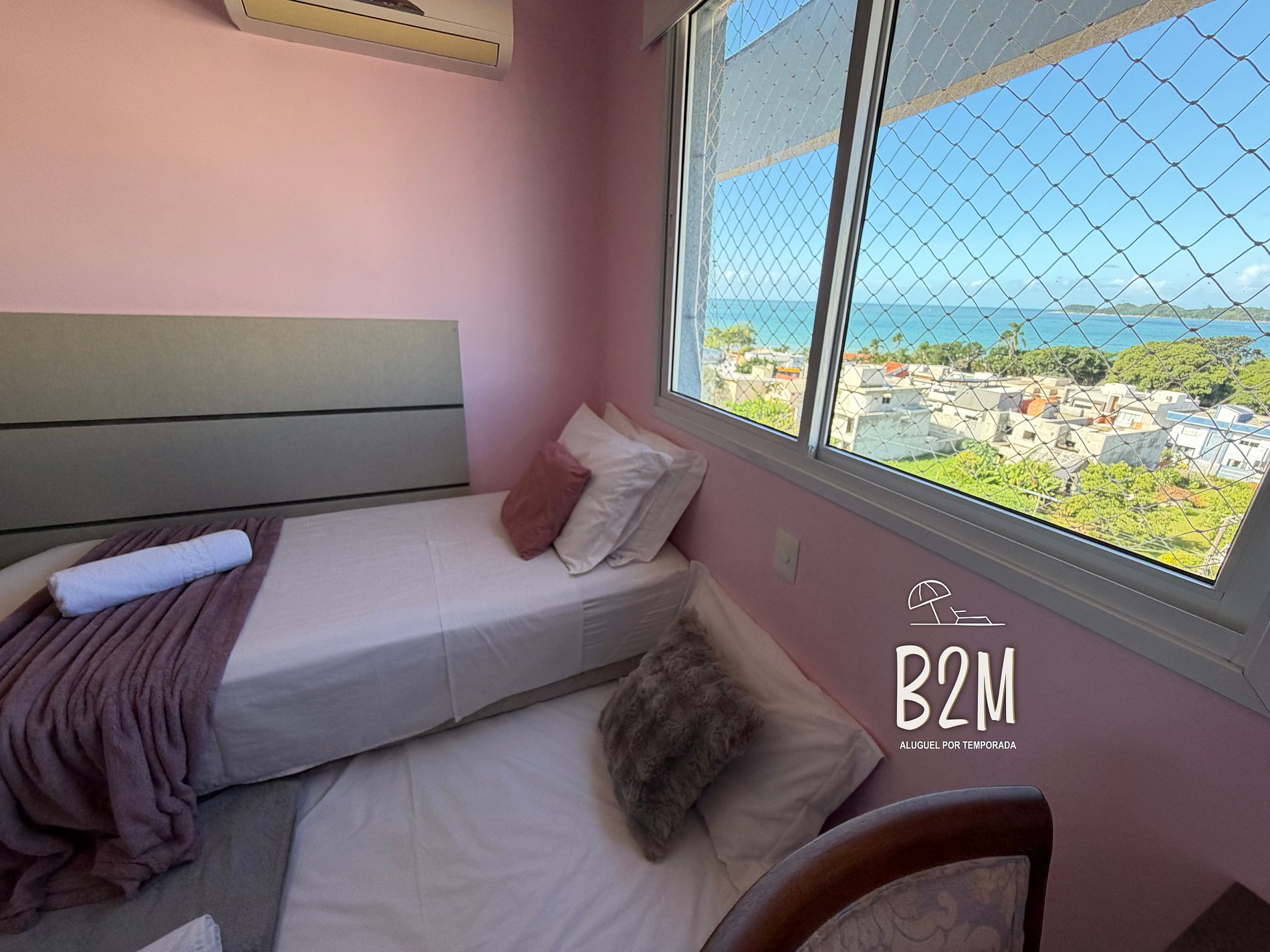 2 camas de solteiro, ar condicionado, armário, janela com vista para o mar