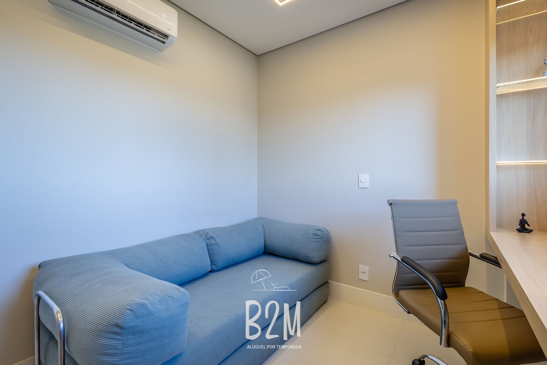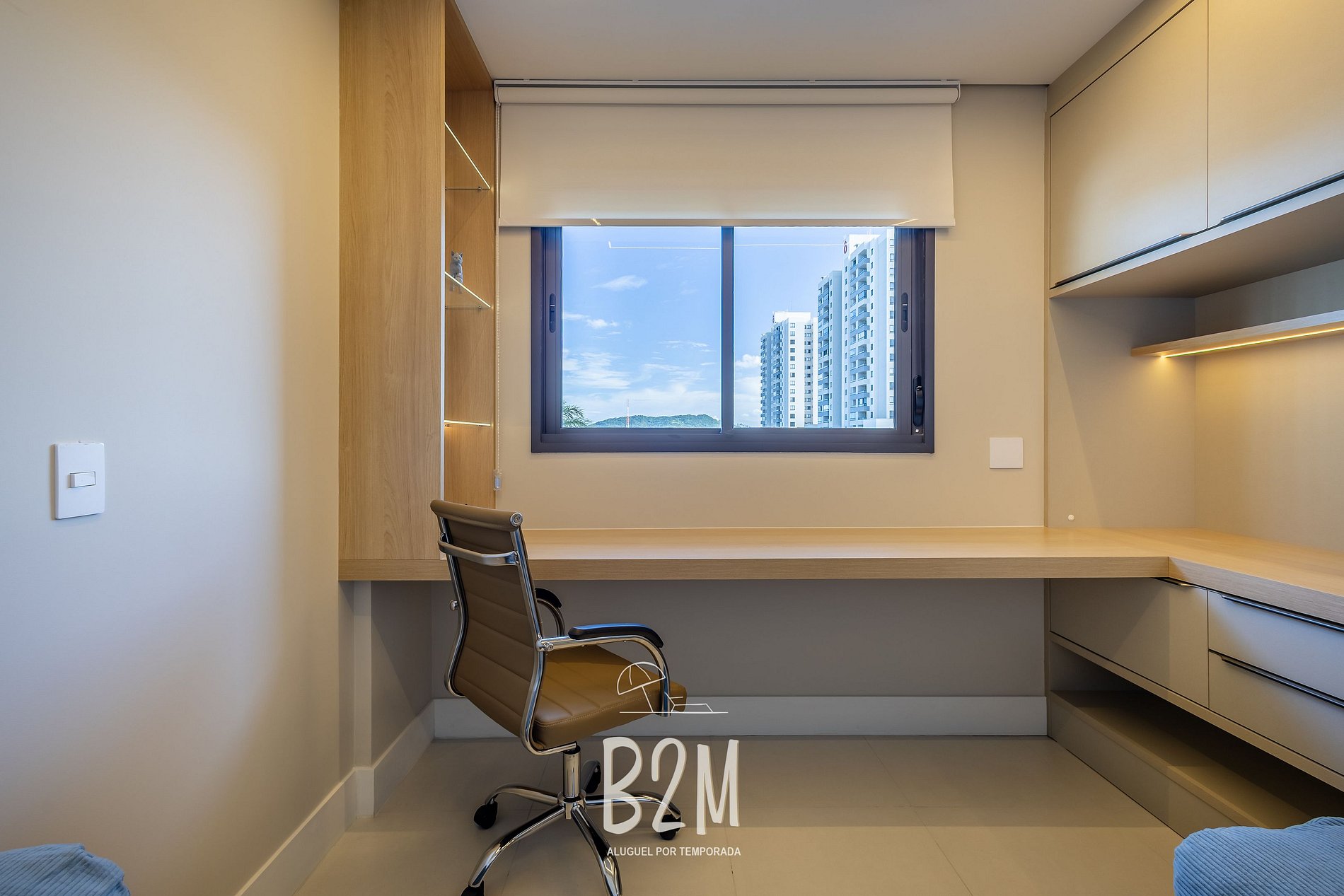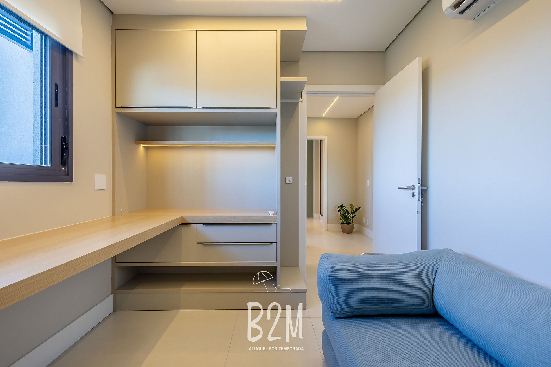 Sofá cama que transforma em 2 colchões de solteiro, roupa de cama completa, ar condicionado, cortina com blackout, guarda roupa, mesa com cadeira para trabalho