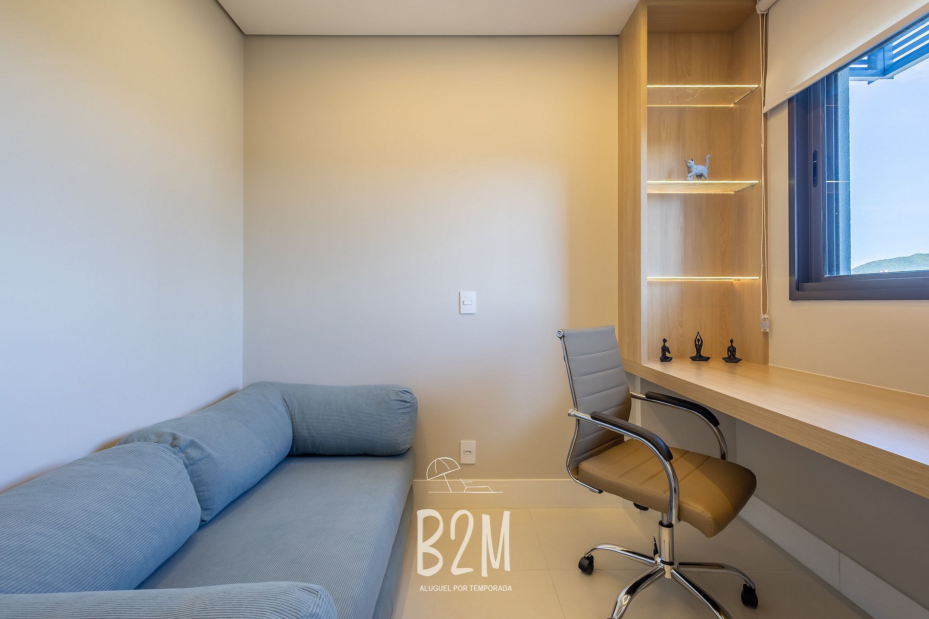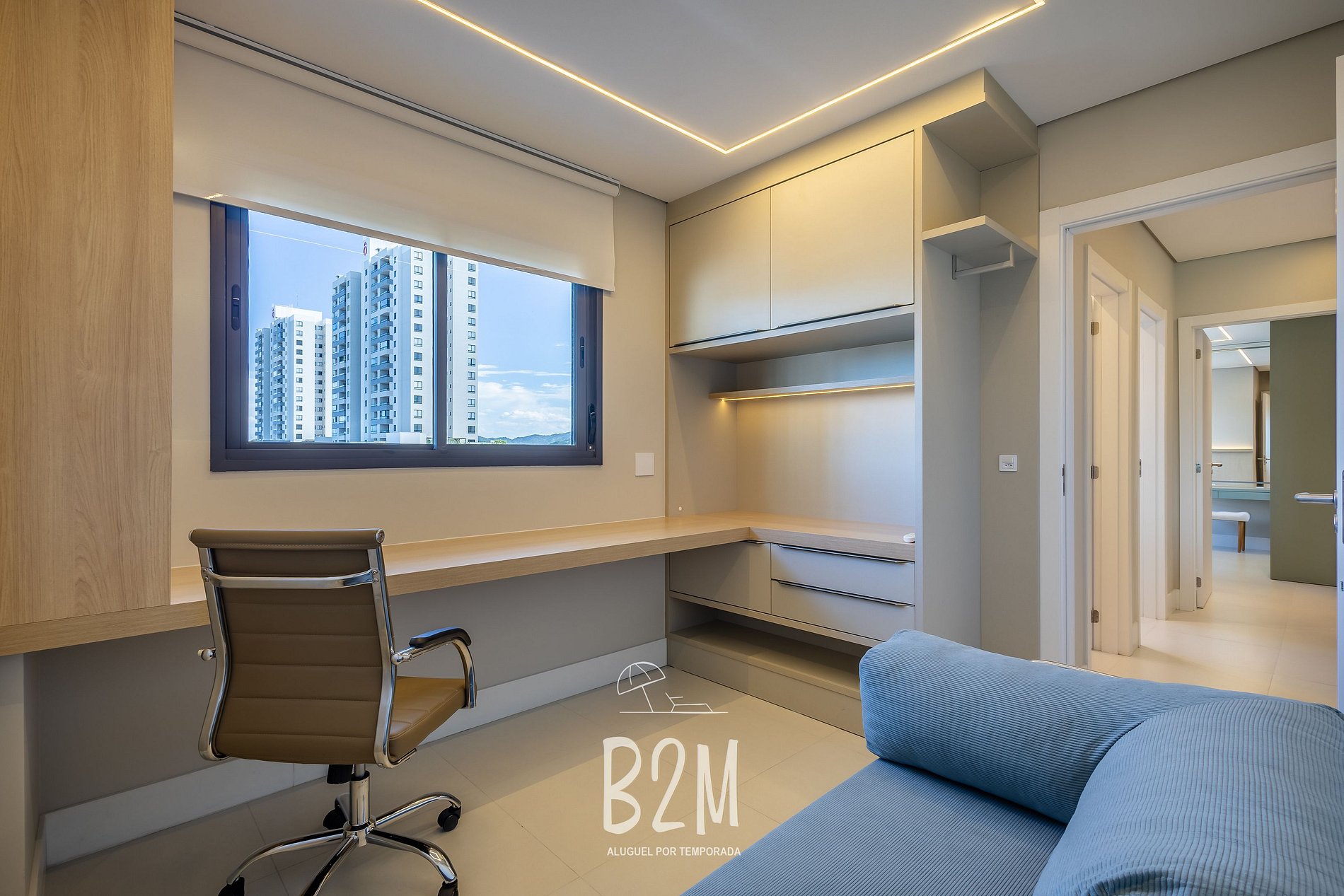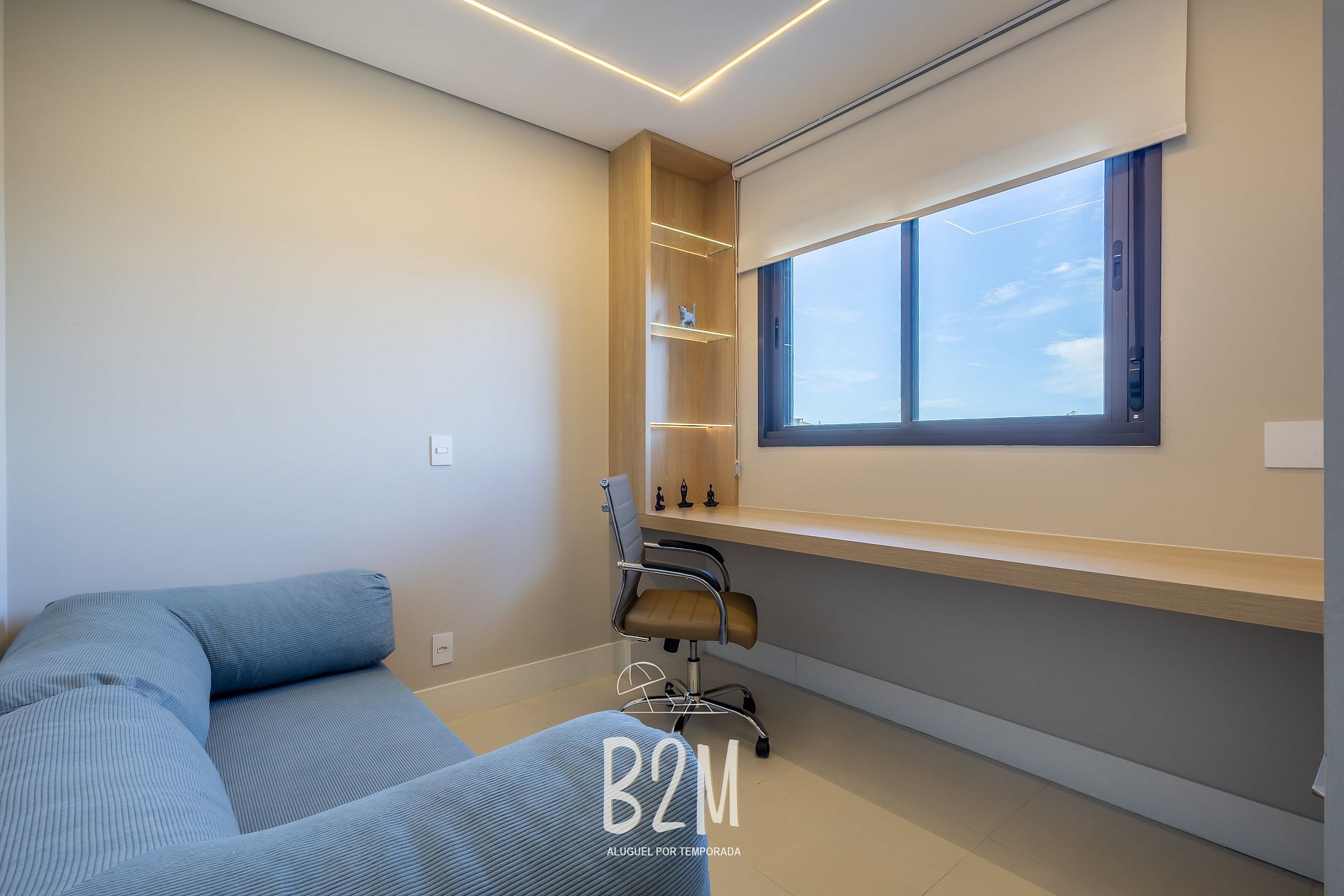 Sofá cama que transforma em 2 colchões de solteiro, roupa de cama completa, ar condicionado, cortina com blackout, guarda roupa, mesa com cadeira para trabalho