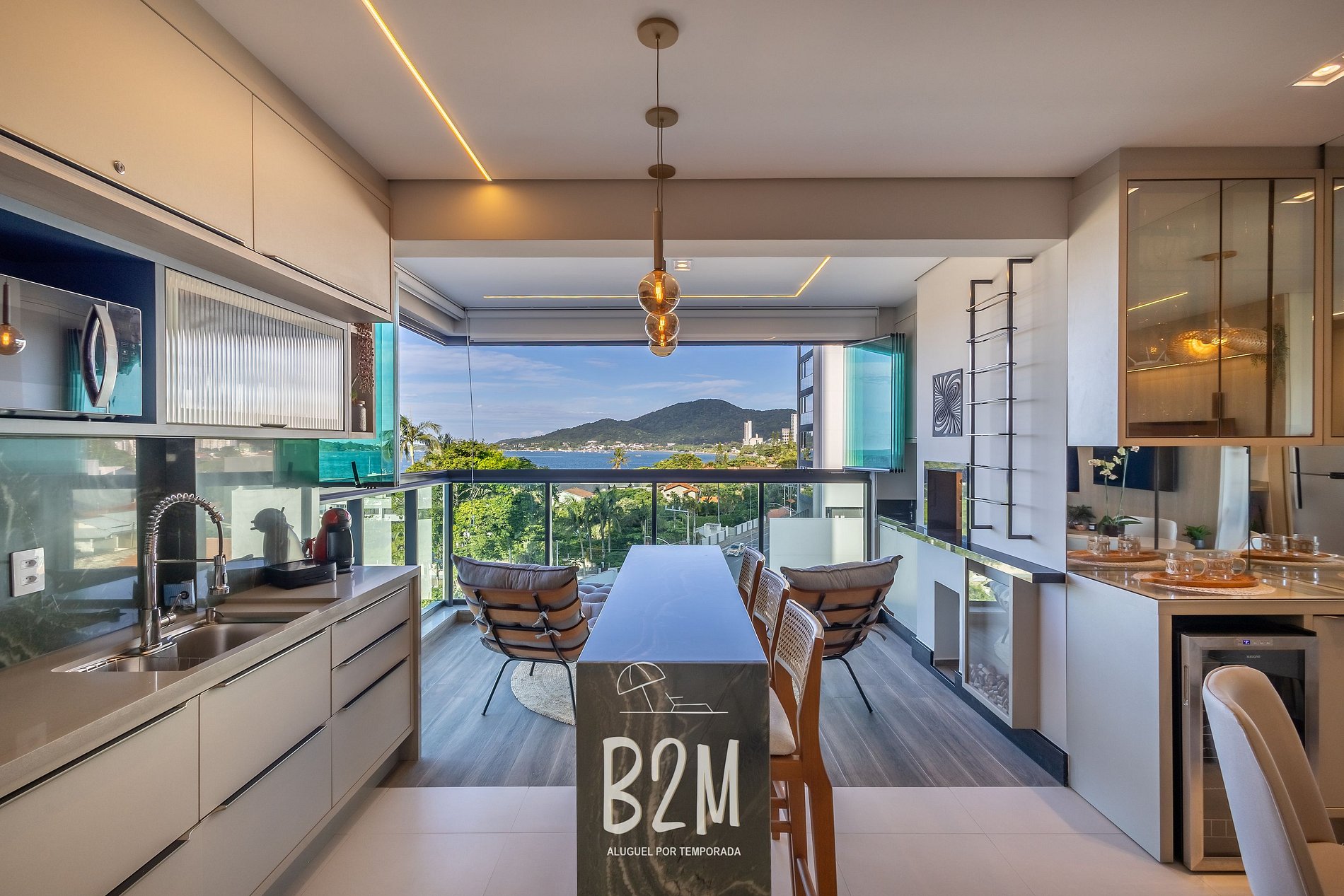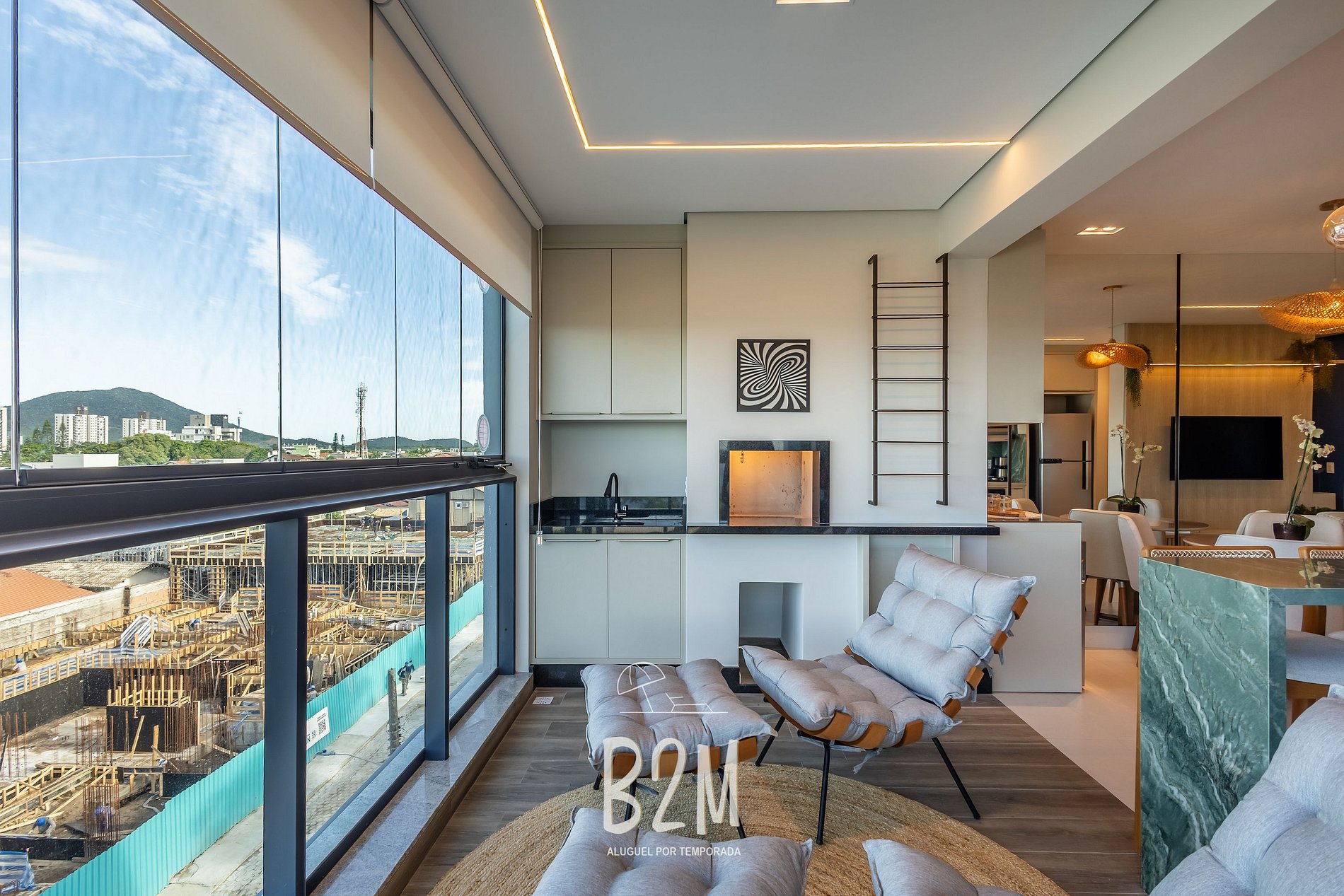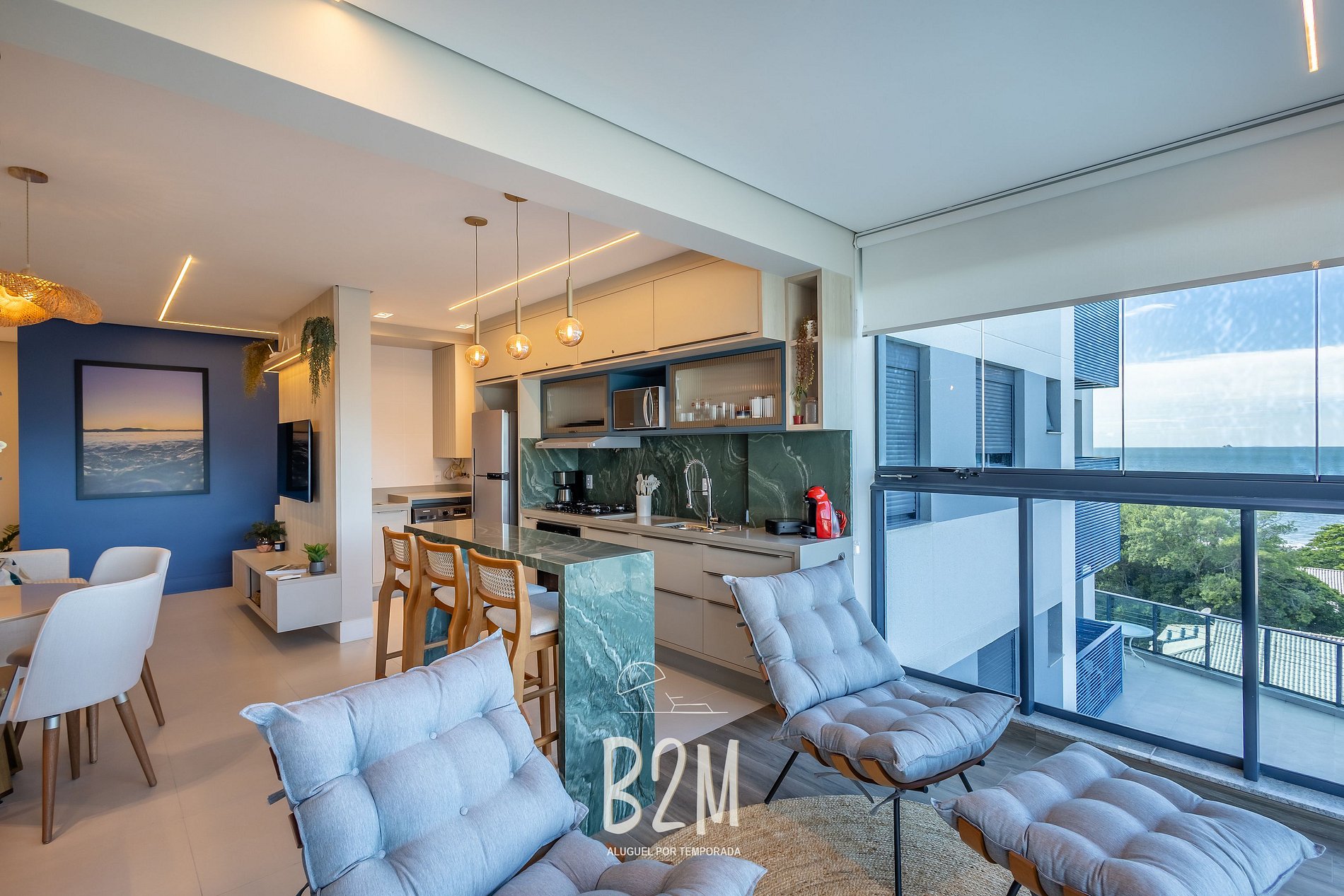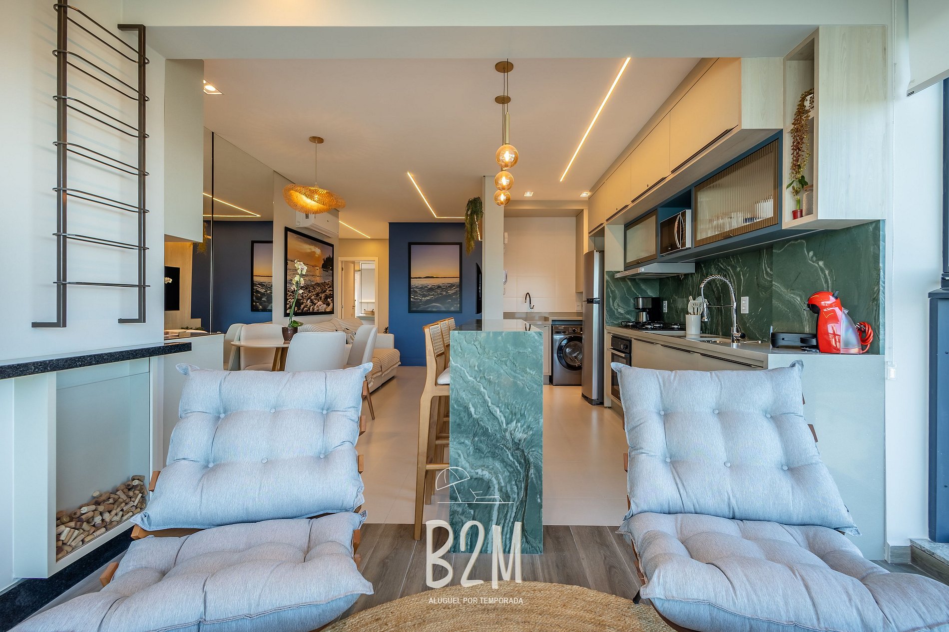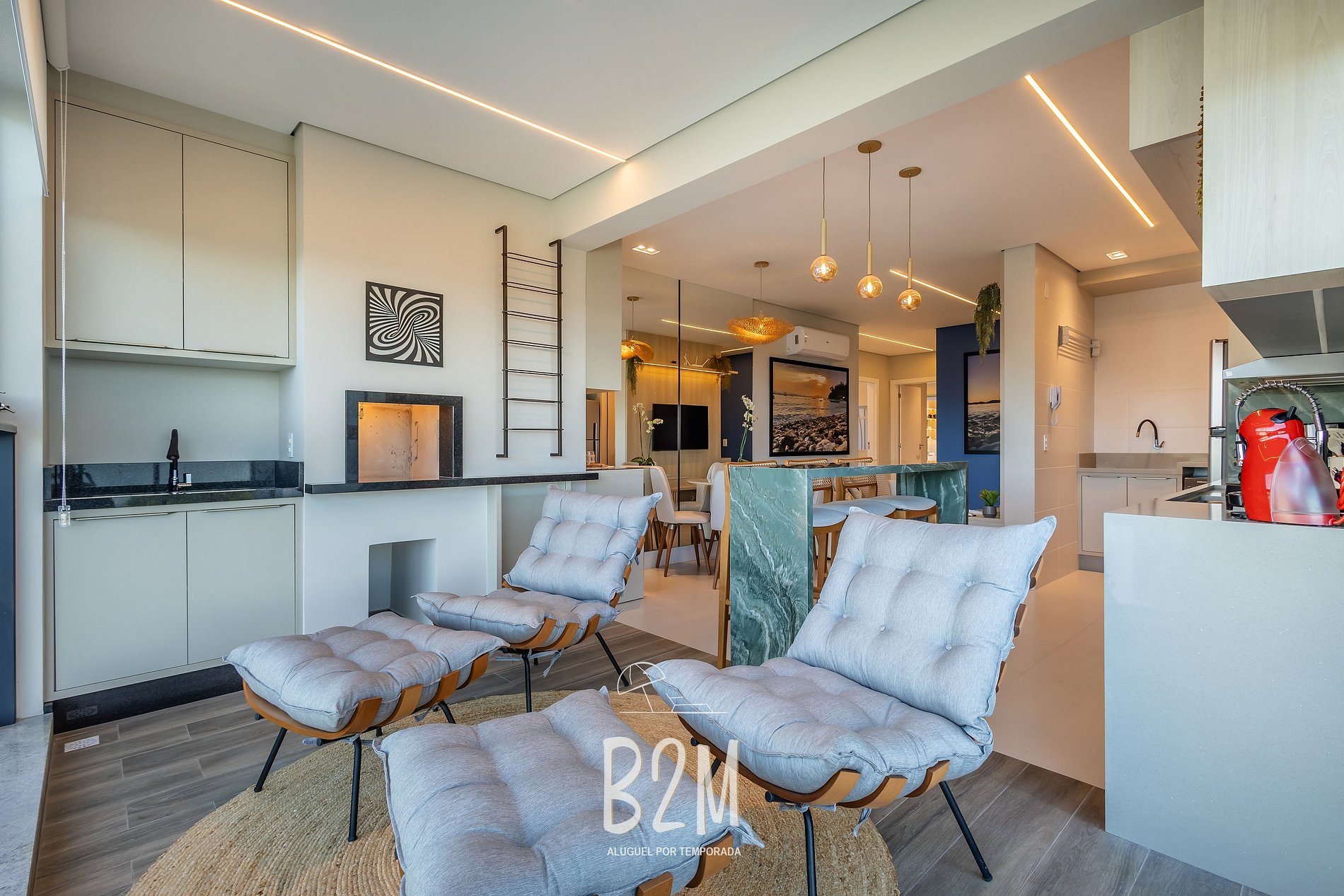 integrada com a sala e a cozinha, churrasqueira, 2 poltronas, vista do mar