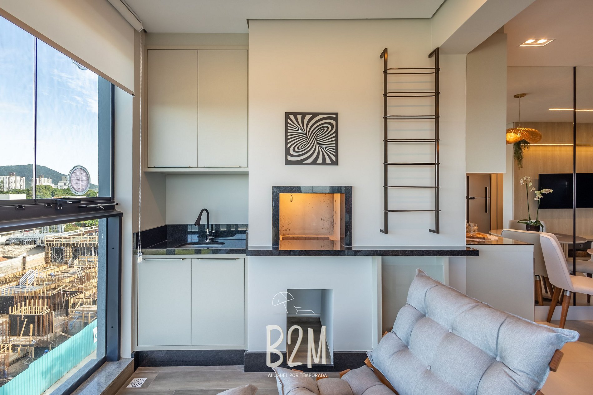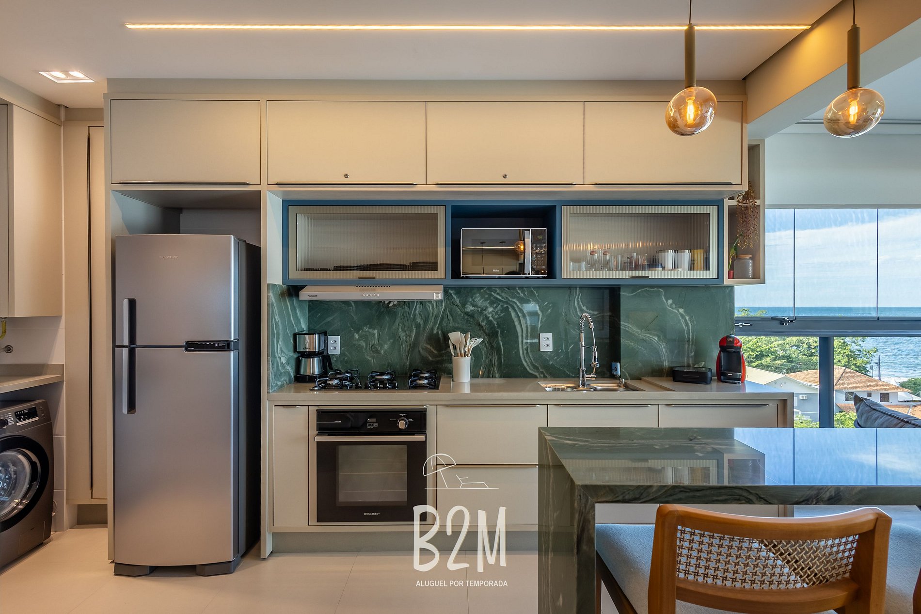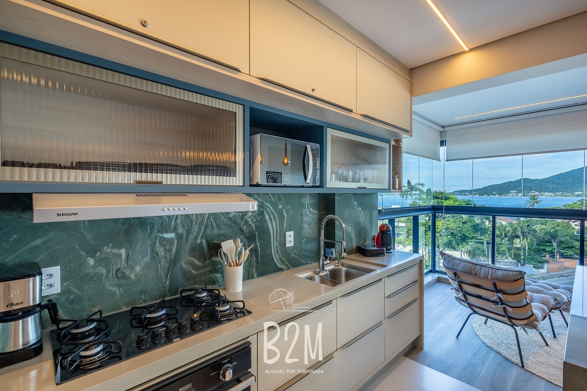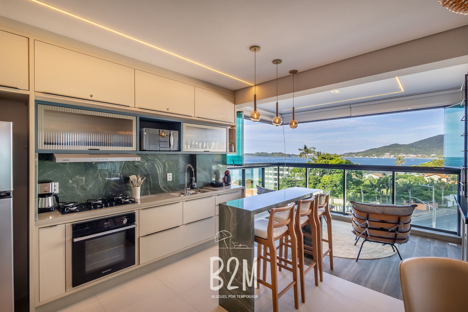 integrada com a sala e a cozinha, churrasqueira, 2 poltronas, vista do mar