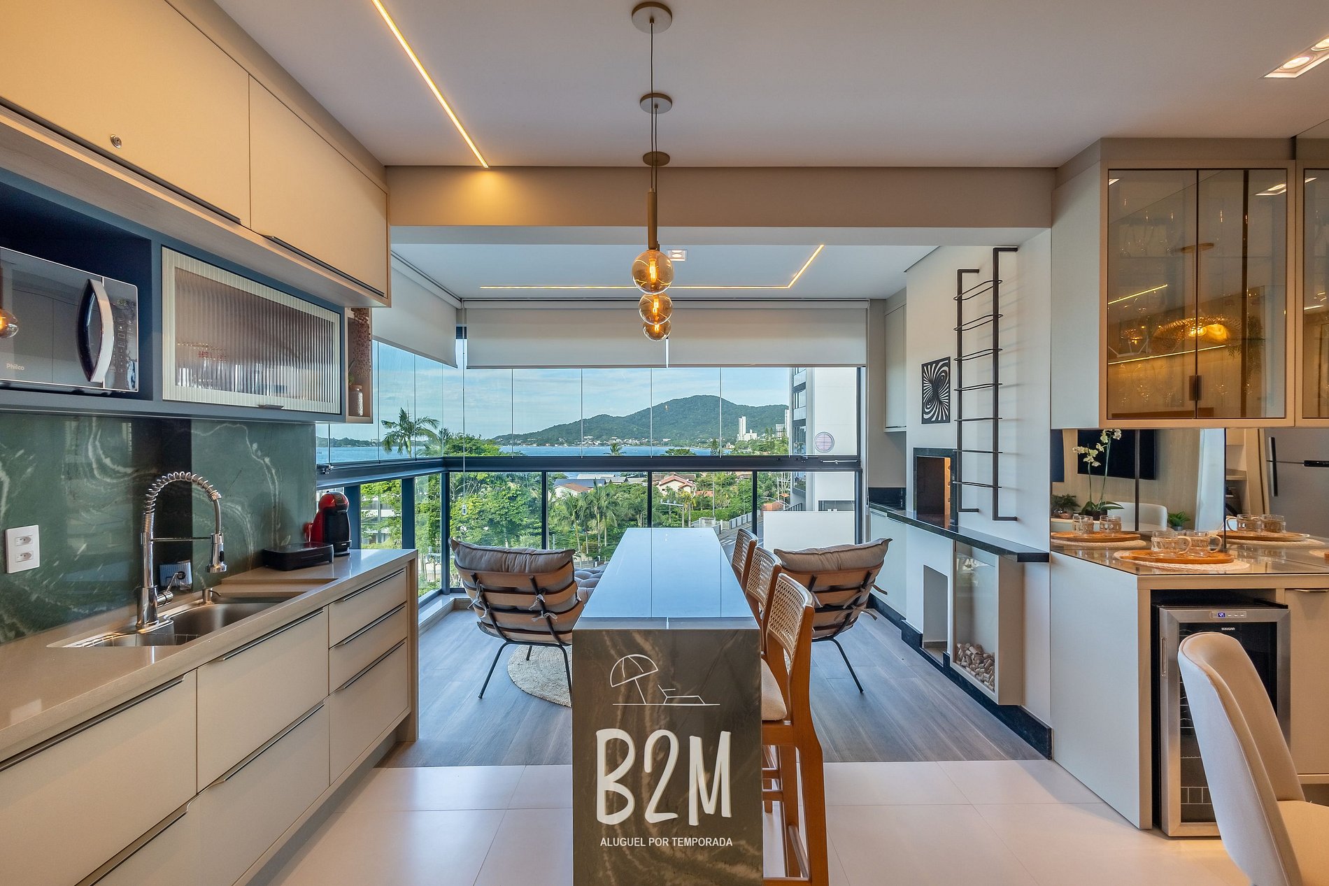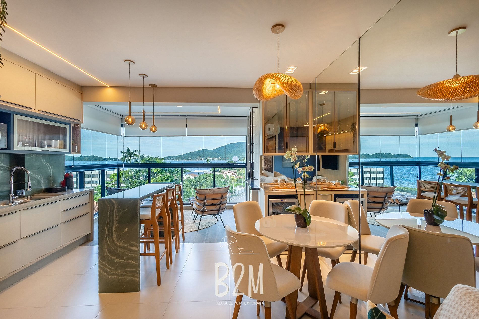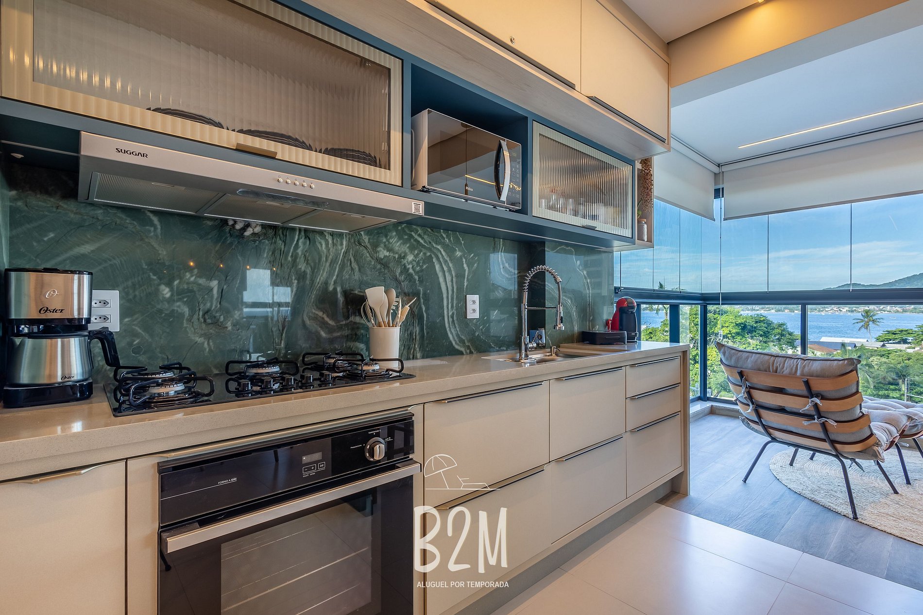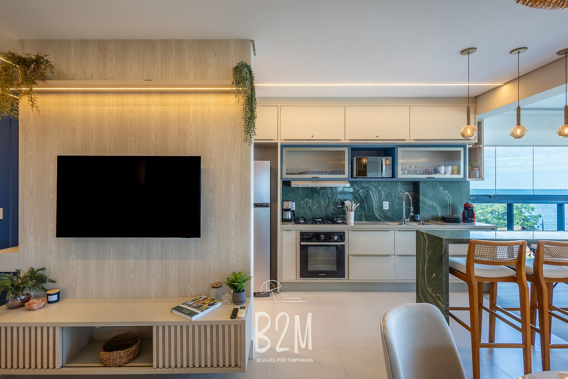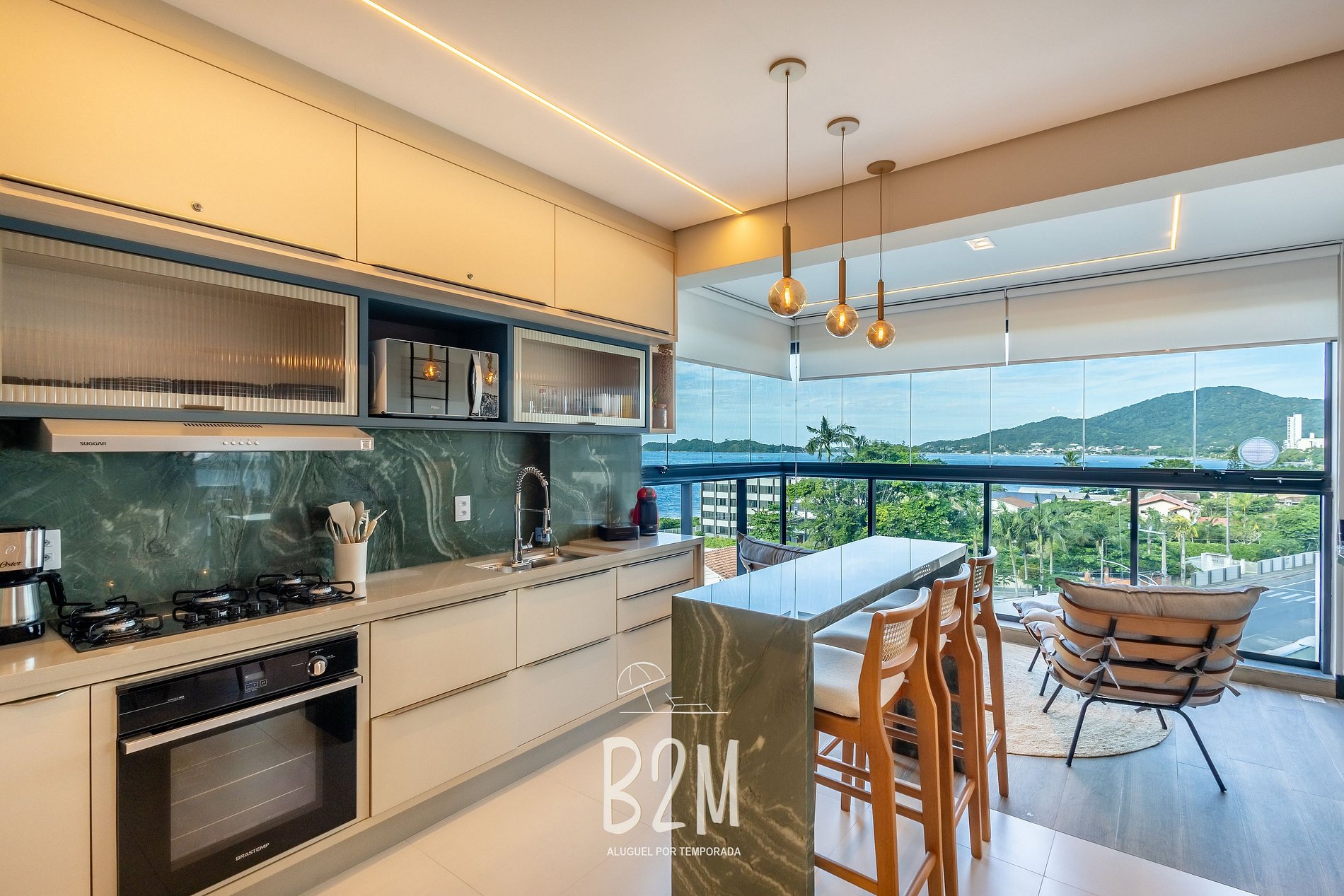 integrada com a sala e a cozinha, churrasqueira, 2 poltronas, vista do mar