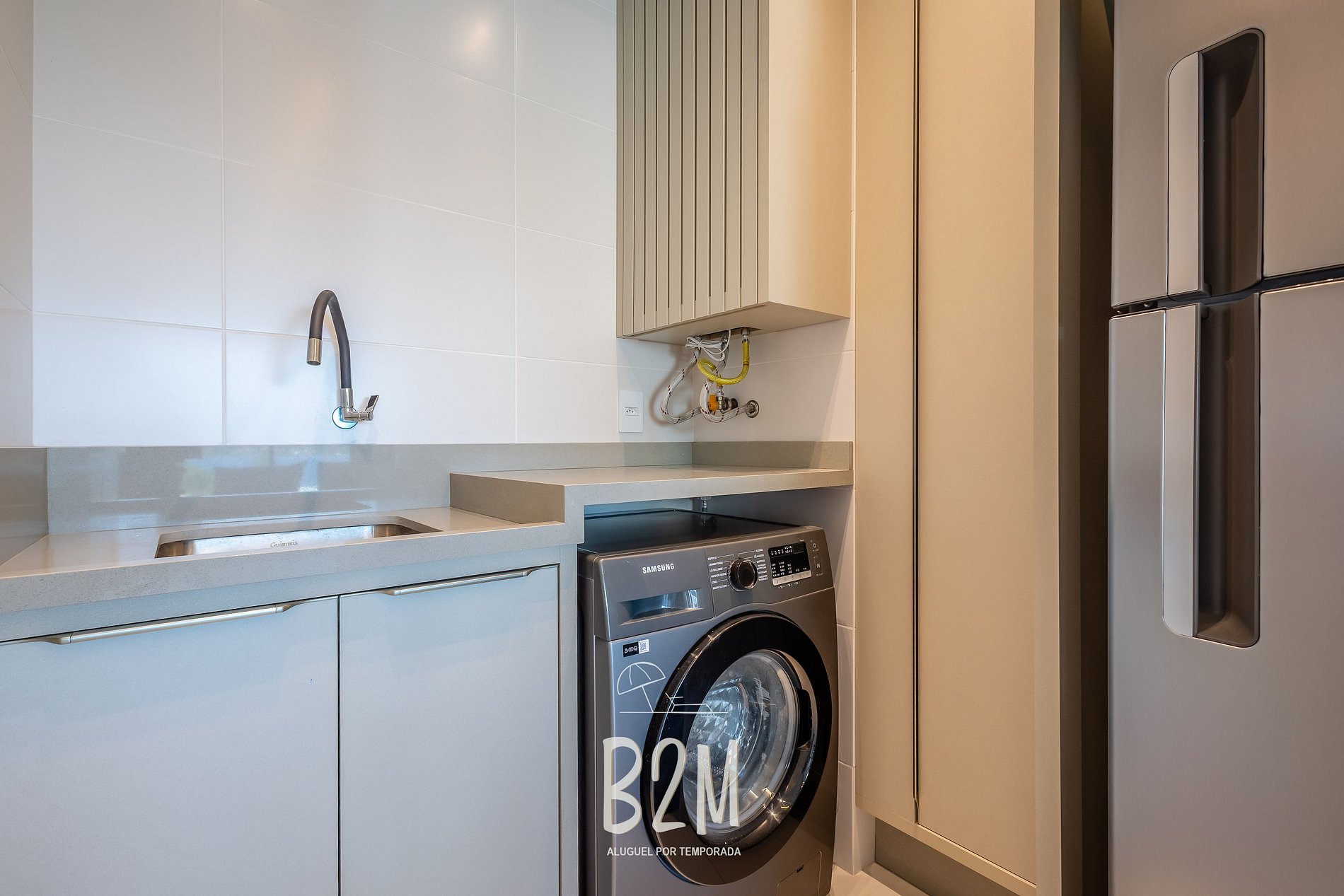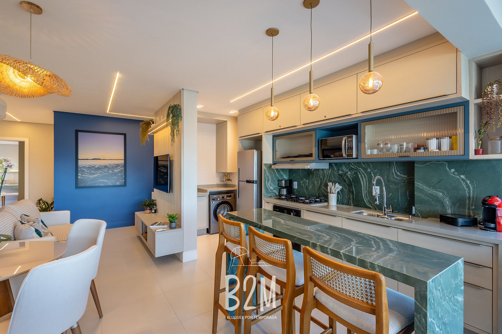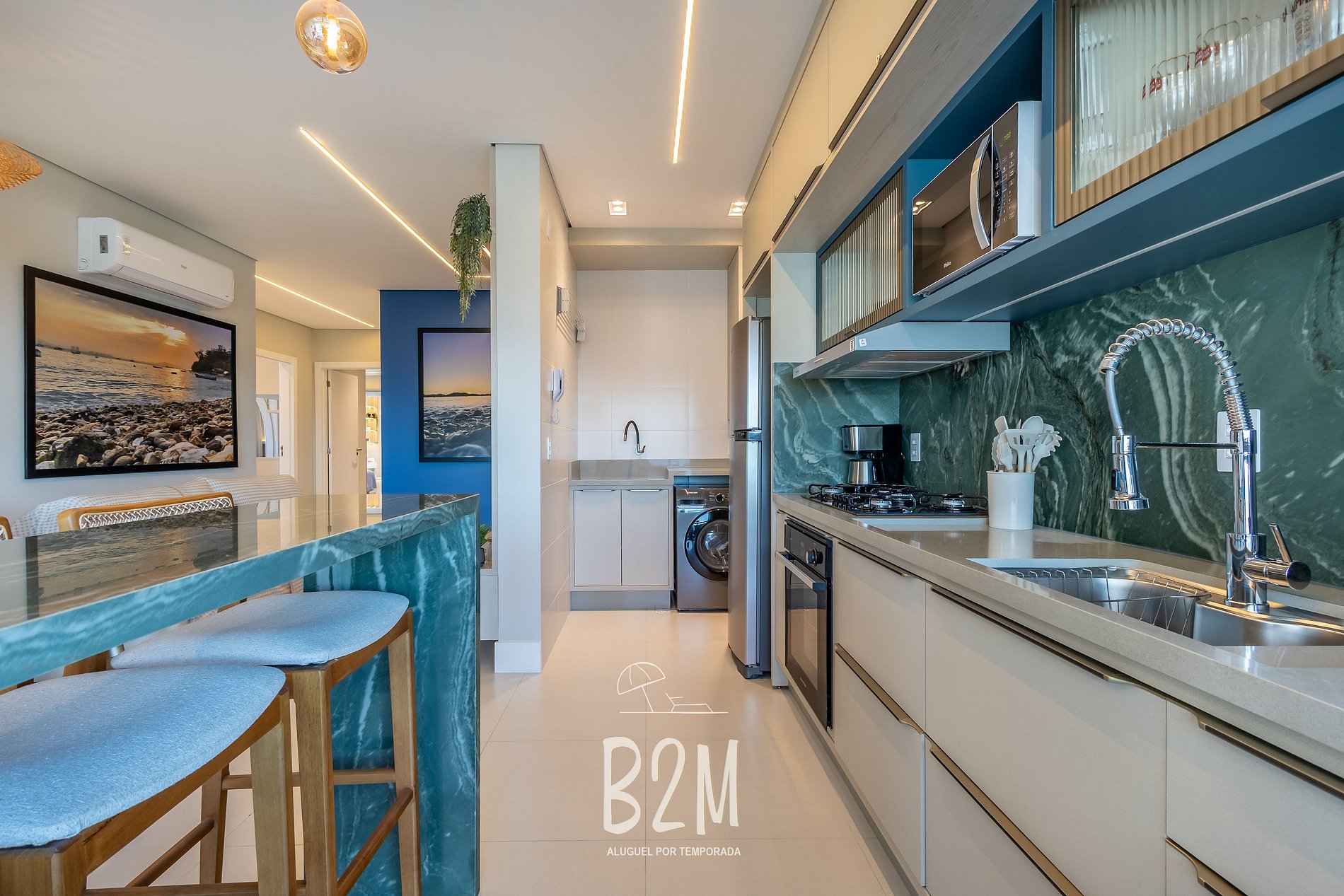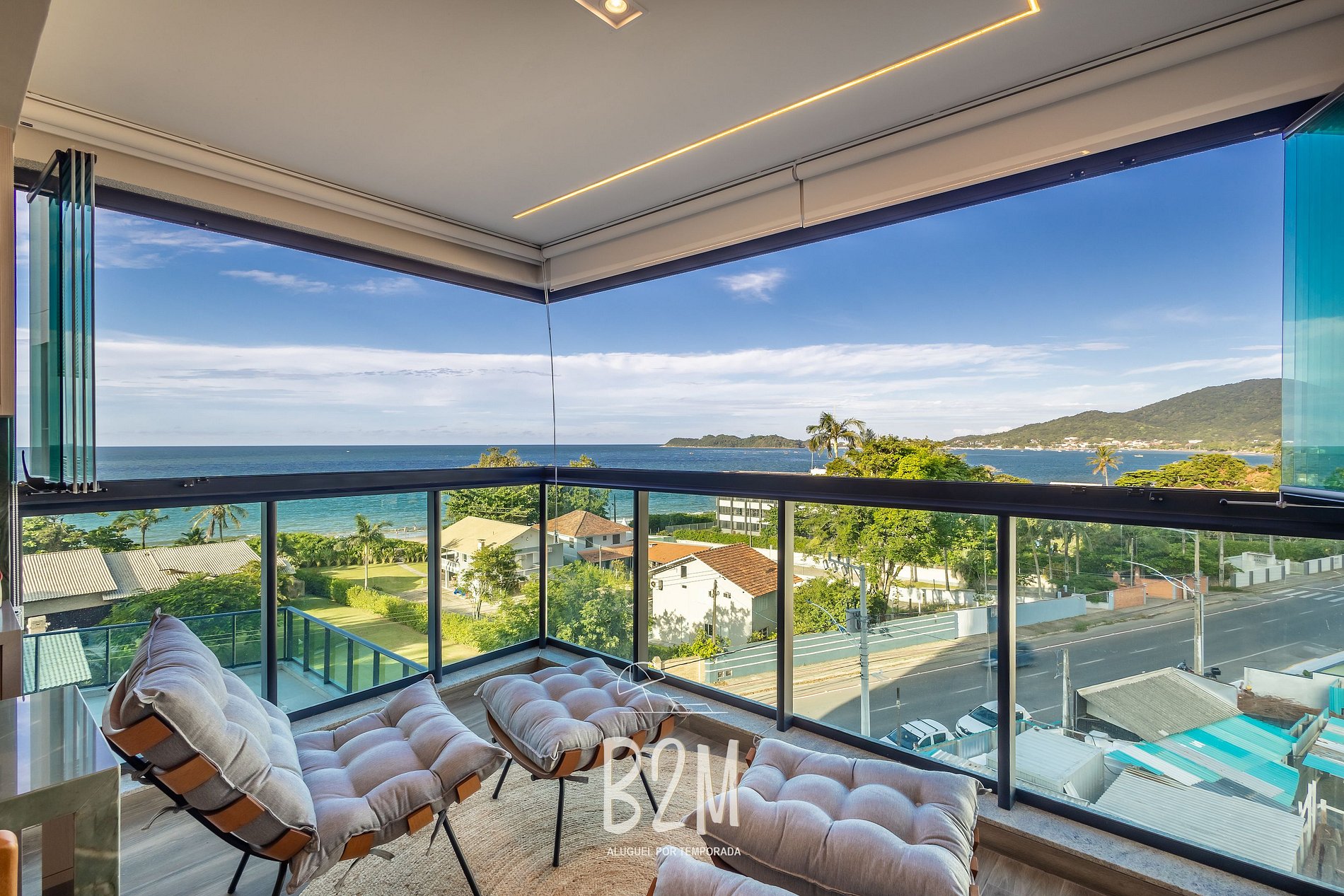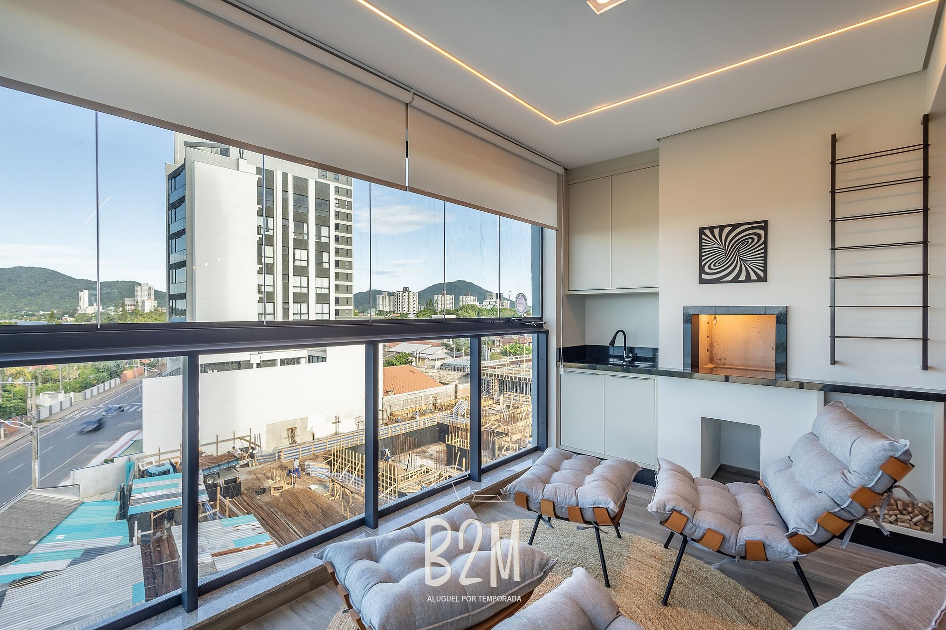 integrada com a sala e a cozinha, churrasqueira, 2 poltronas, vista do mar