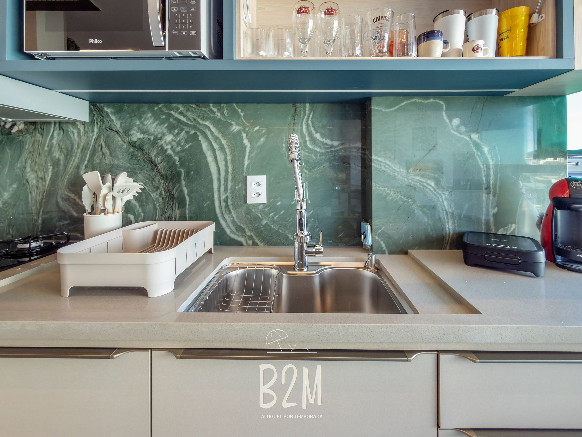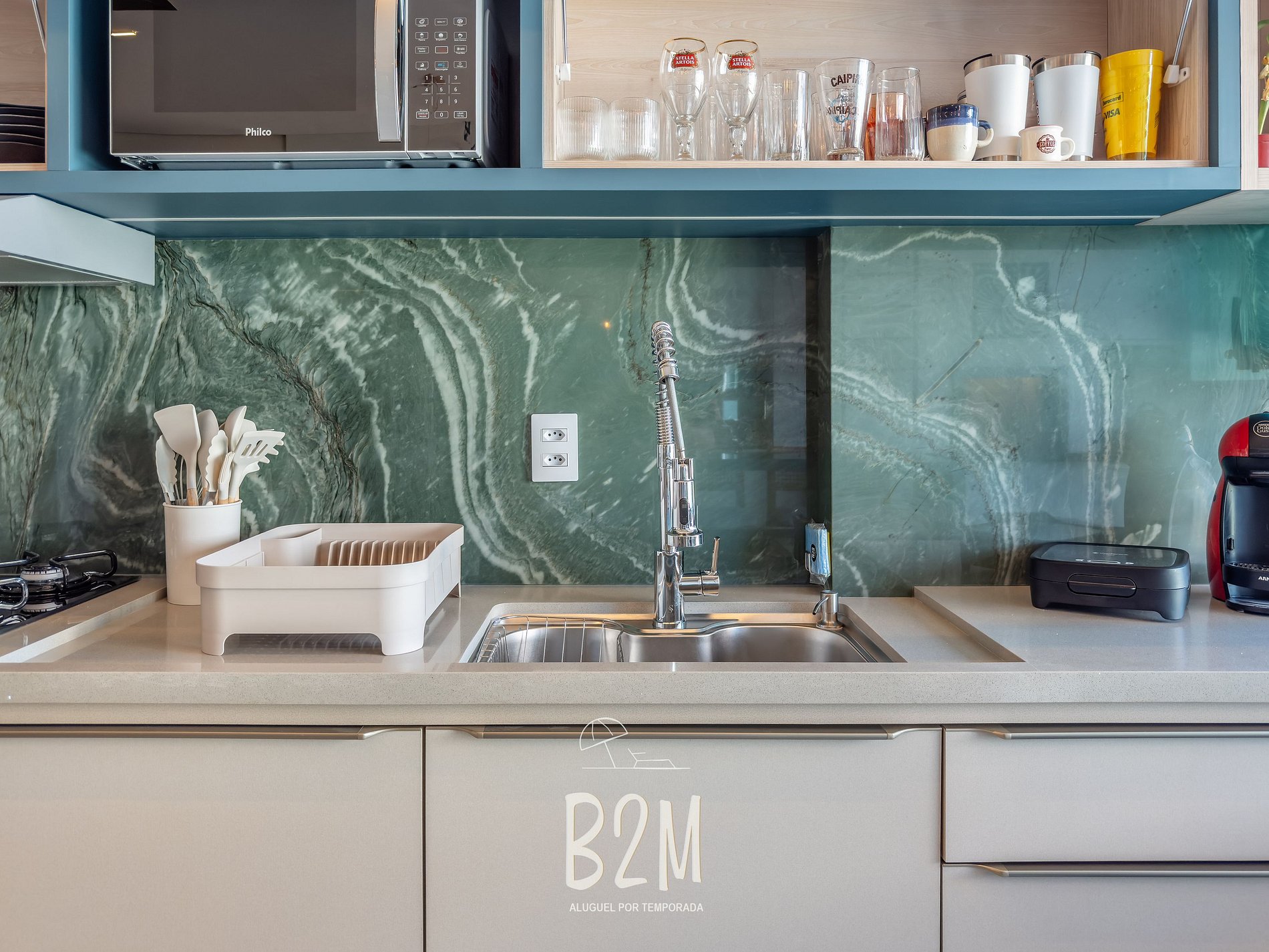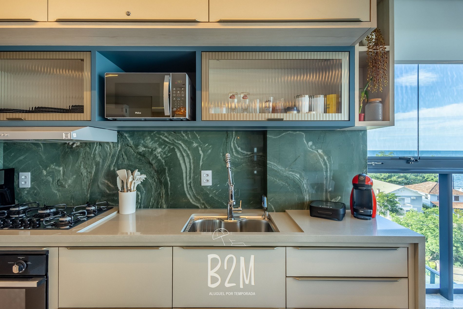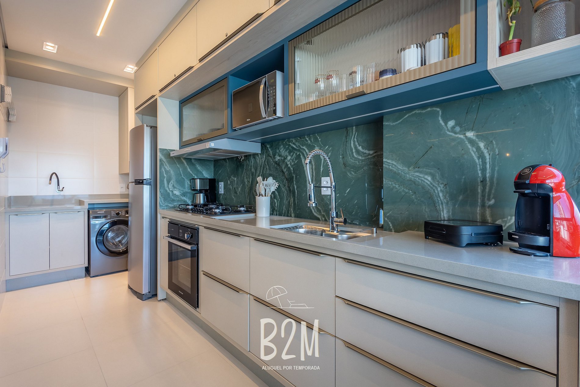 geladeira, microondas, fogão, forno, liquidificador, sanduicheira, cafeteira elétrica, maquina de café expresso, balcão com 3 cadeiras altas, panelas, talheres e utensílios para o preparado de refeições.