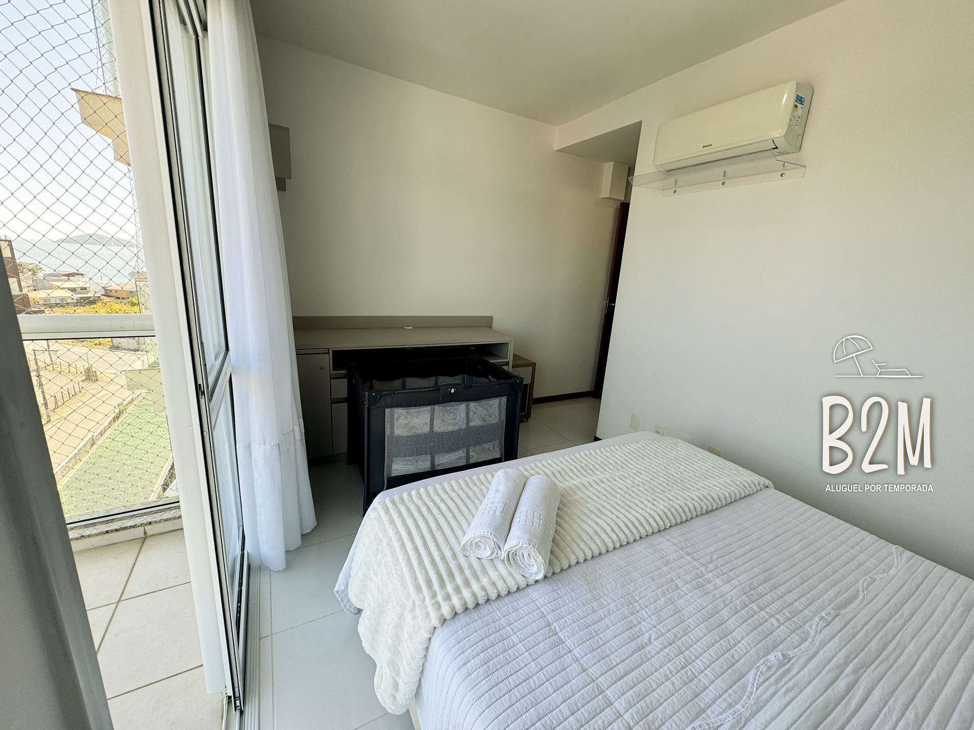 varanda com vista do mar, 1 cama queen, 1 berço, ar condicionado, cômoda, banheiro privativo com água aquecida a gás