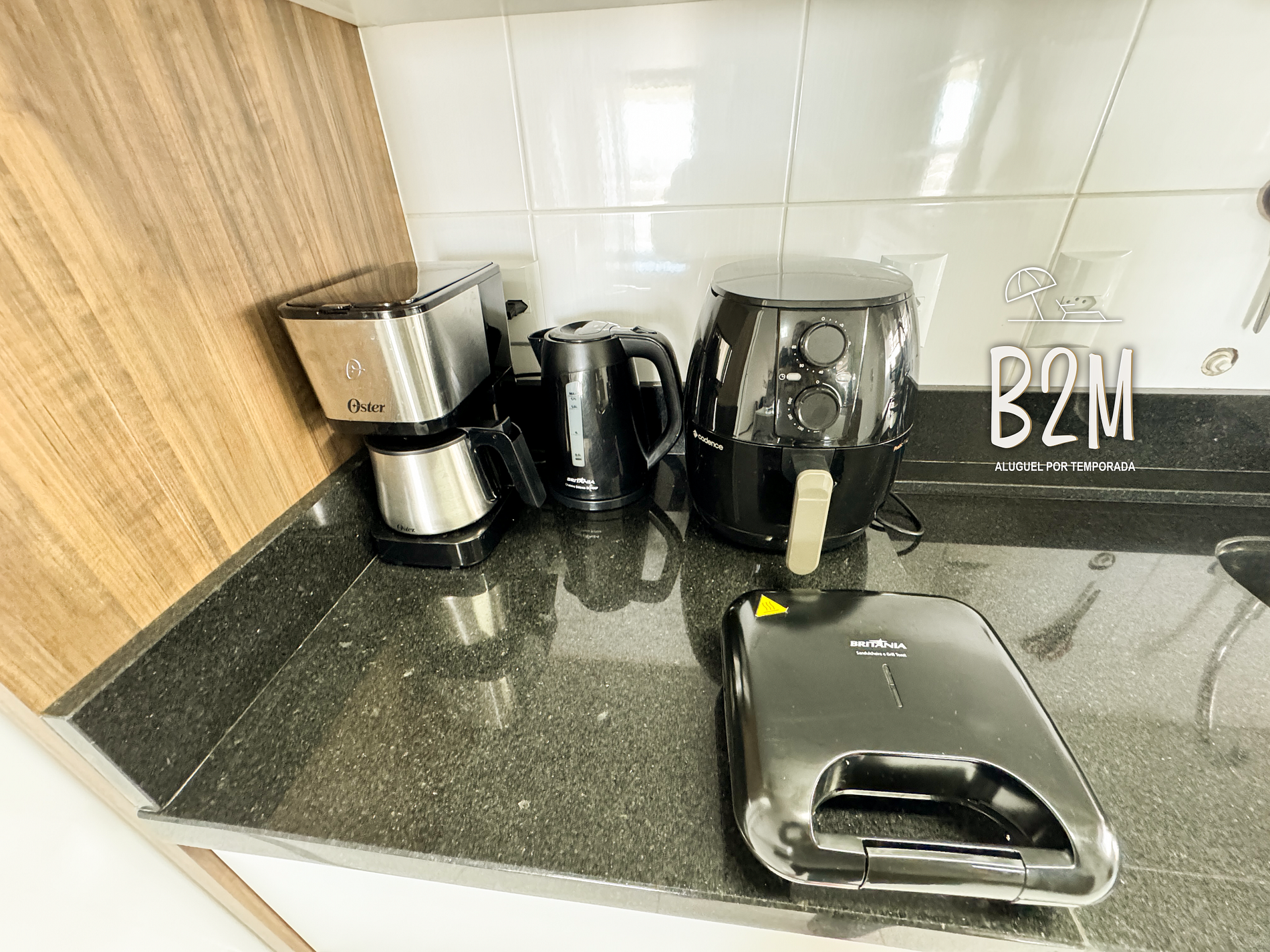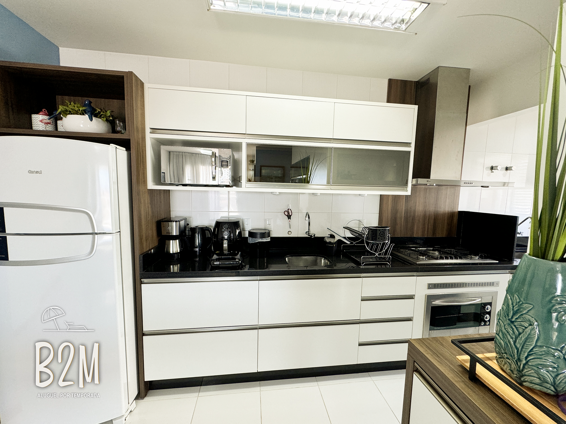 geladeira, microondas, fogão, forno, liquidificador, sanduicheira, air fryer, panelas, talheres e utensílios para o preparado de deliciosas refeições.