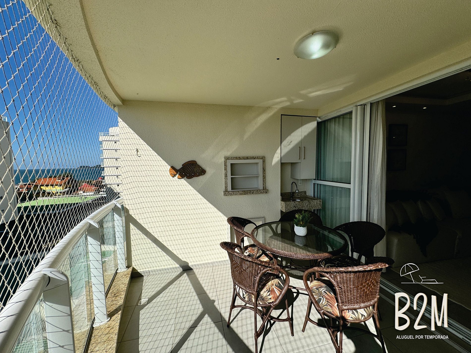 vista do mar, churrasqueira, pia com bancada, mesa com 5 cadeiras