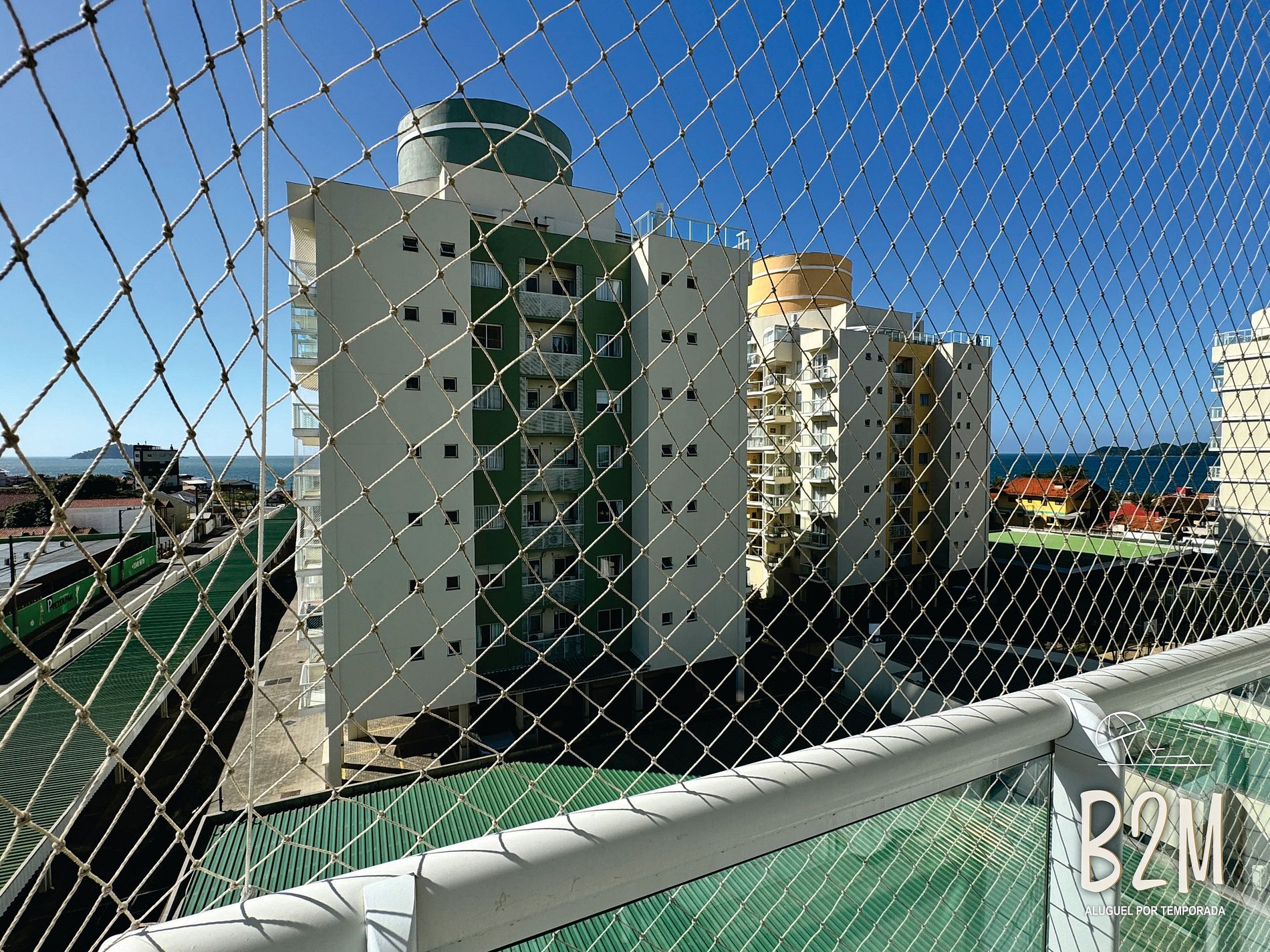 varanda com tela de proteção e vista do mar, 1 cama queen, ar condicionado, televisão, armário, banheiro privativo