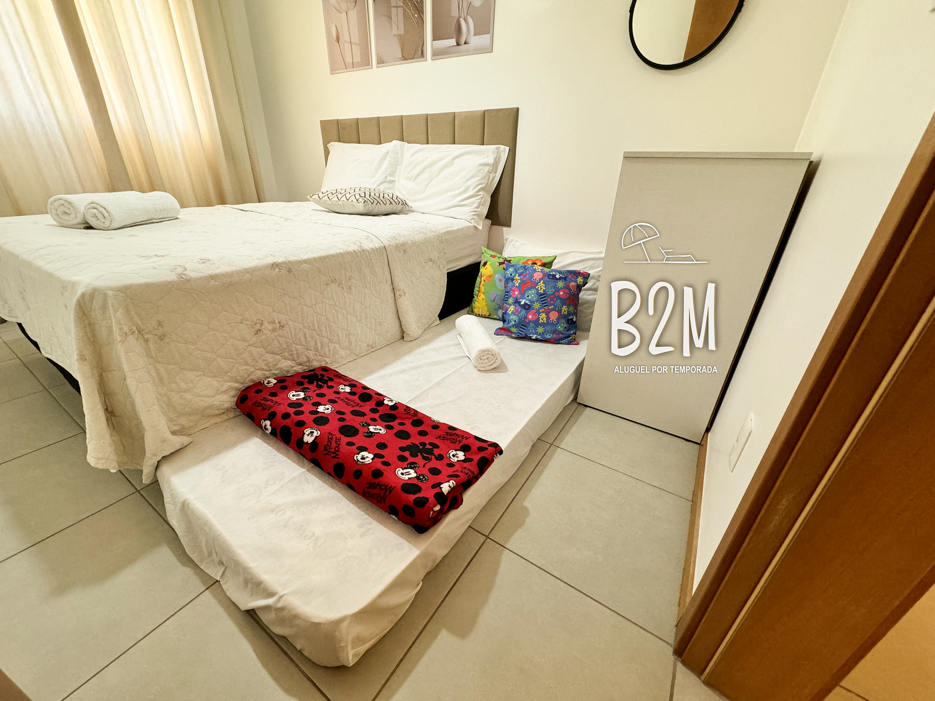 janela com tela de proteção, 1 cama de casal, 1 colchão de solteiro extra, ar condicionado, cômoda