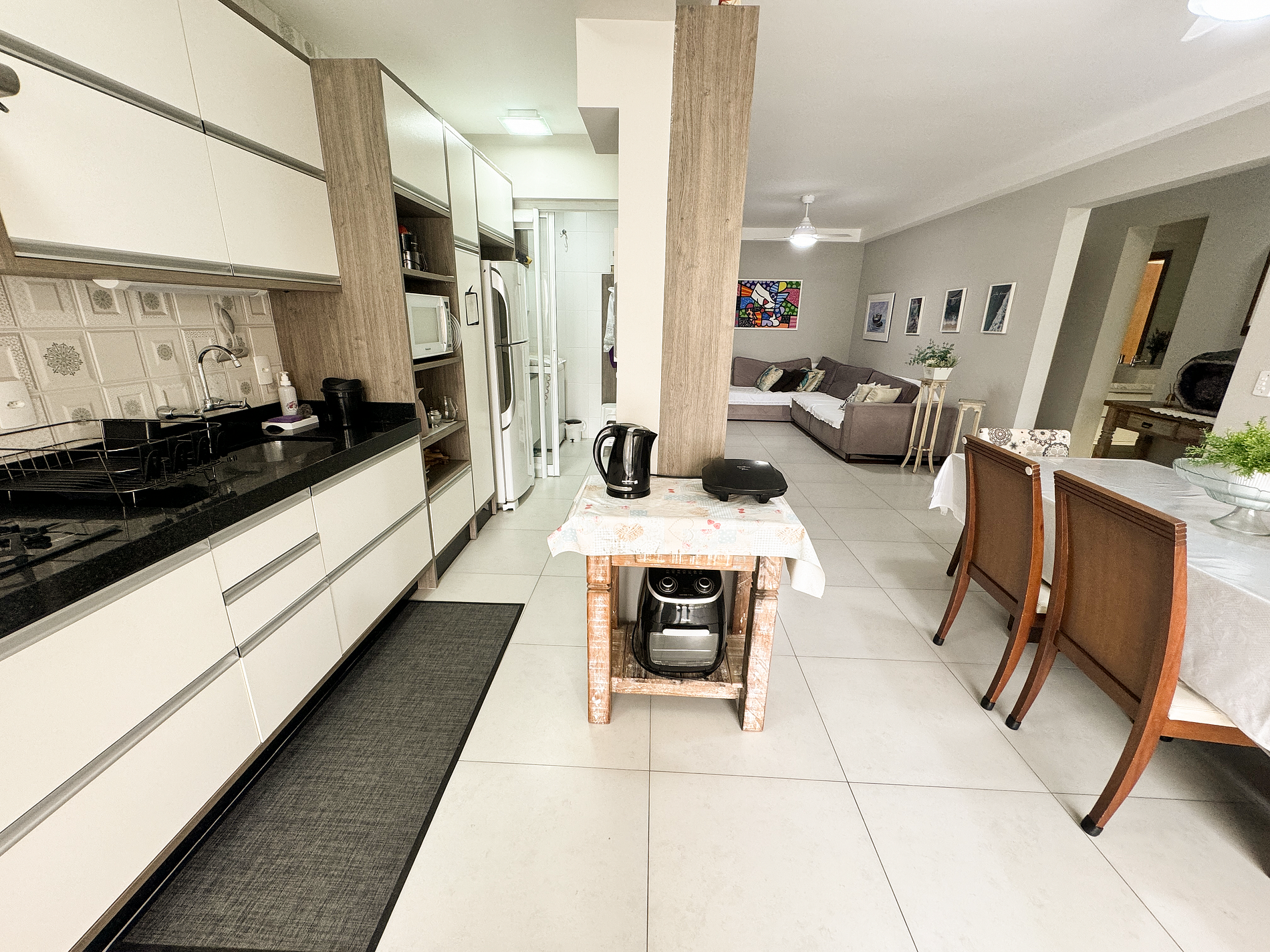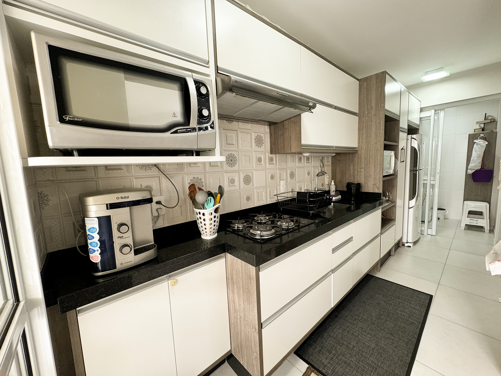 geladeira, bebedouro, microondas, fogão, forno elétrico, airfryer, sanduicheira, cafeteira, liquidificador, panelas, talheres e utensílios para o preparado de refeições