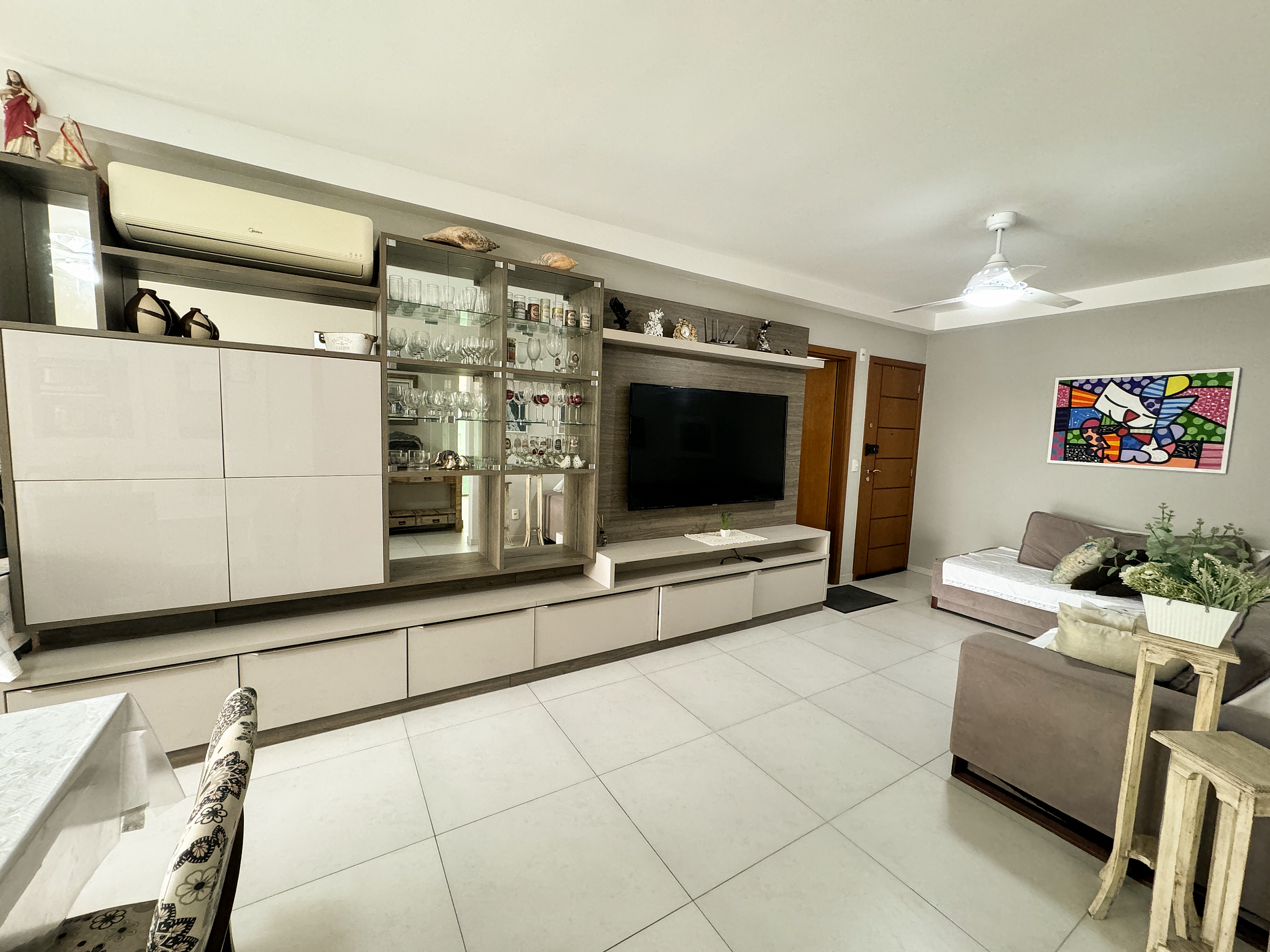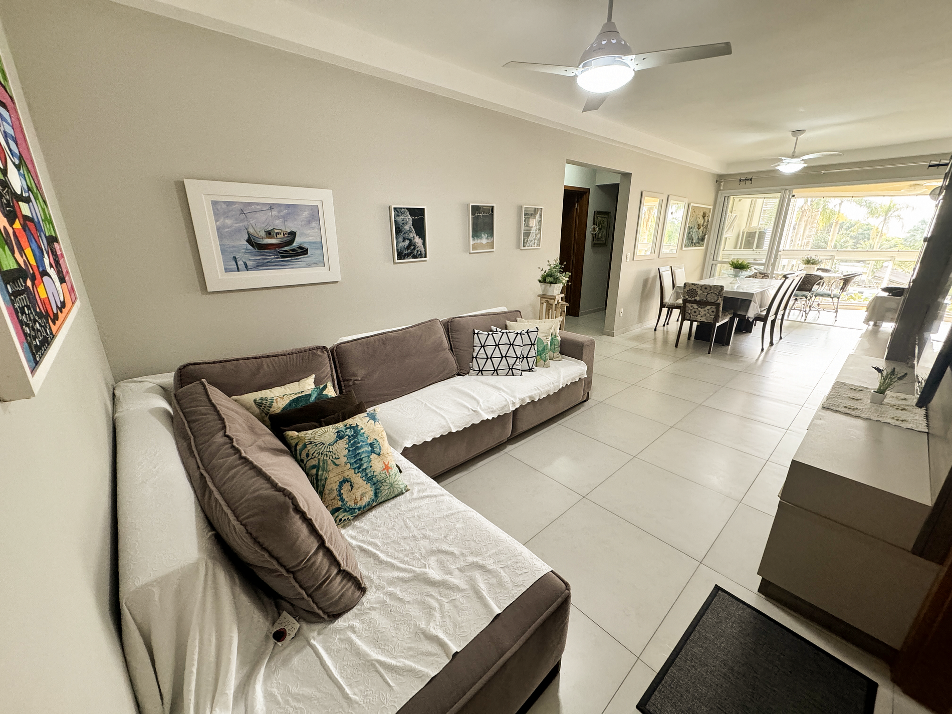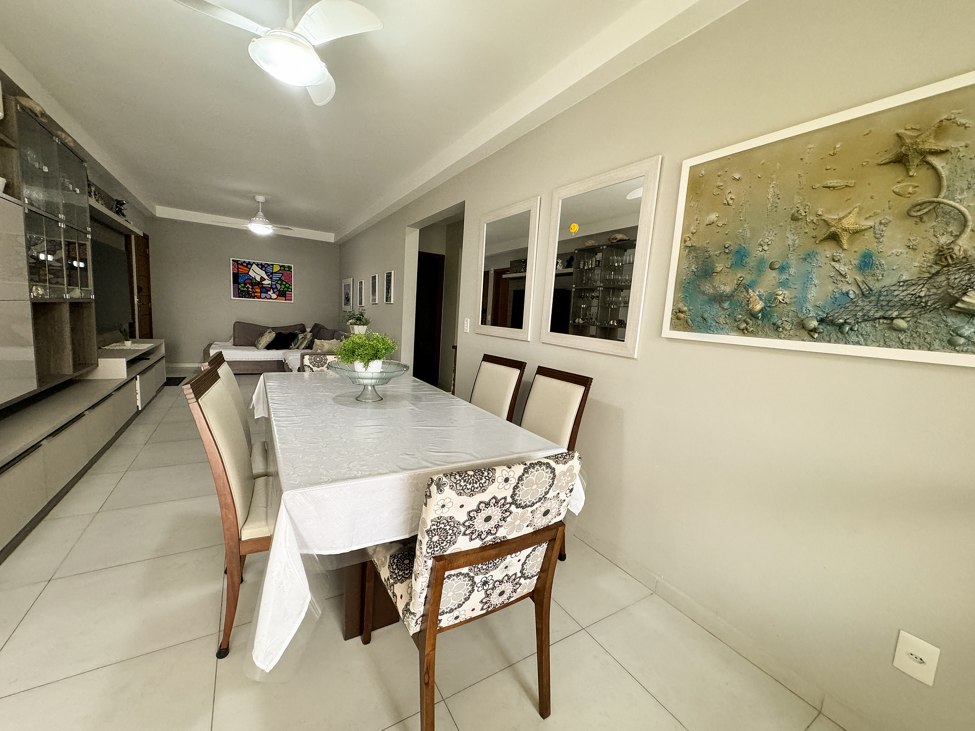 sofá, televisão, internet wifi, mesa de jantar para 6 pessoas, cristaleira, ventilador