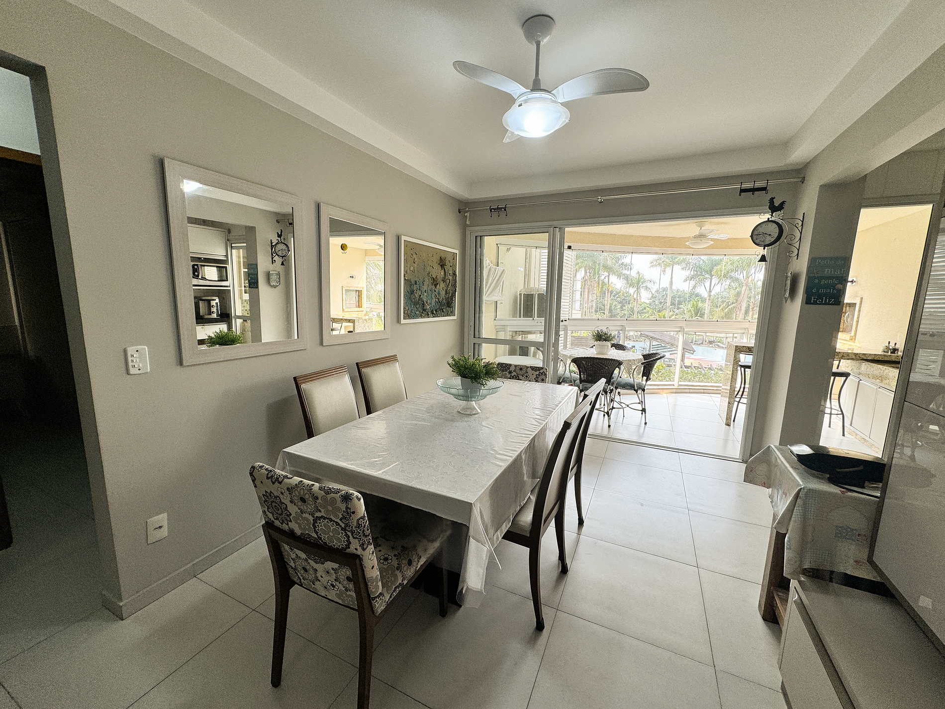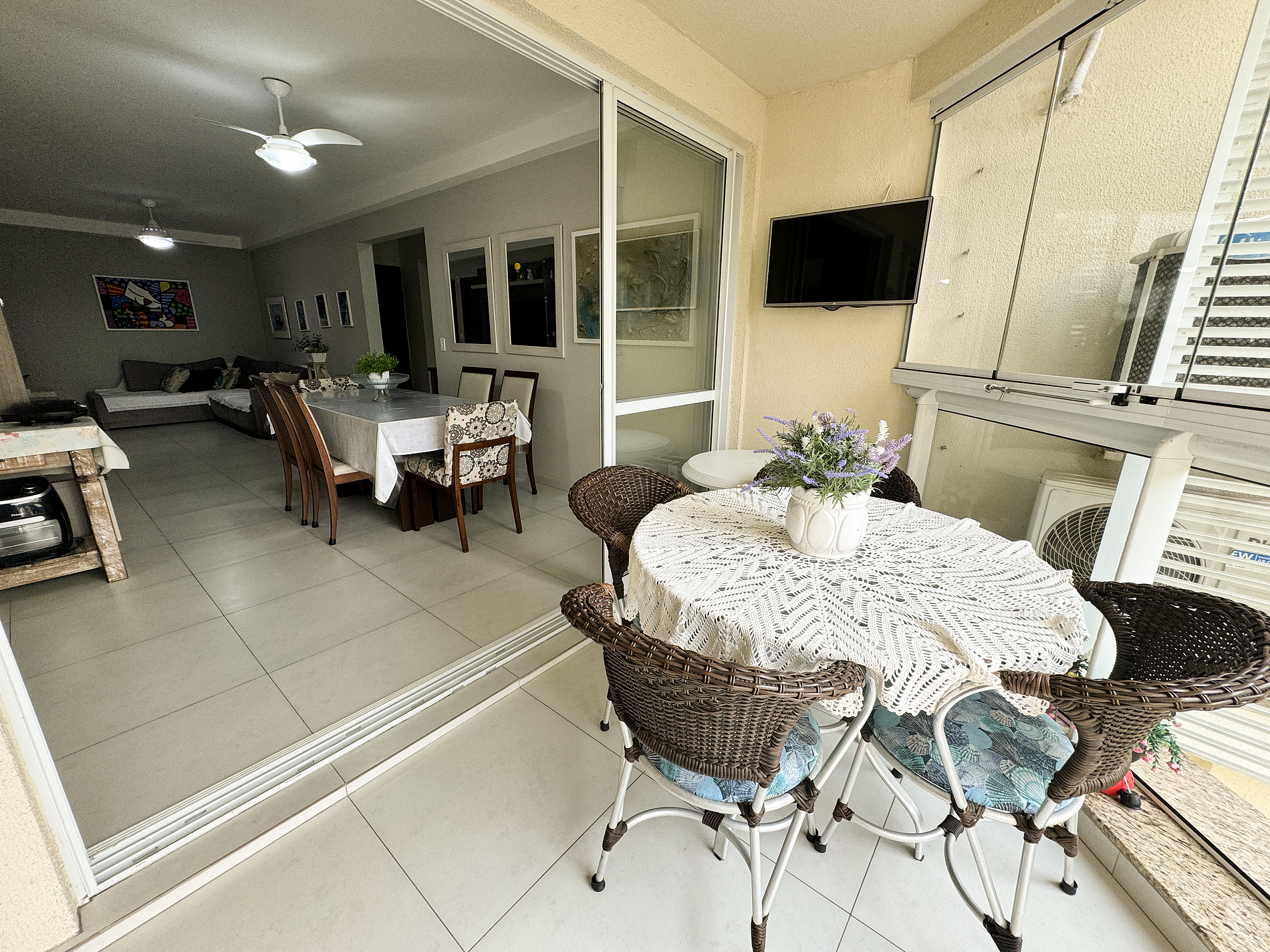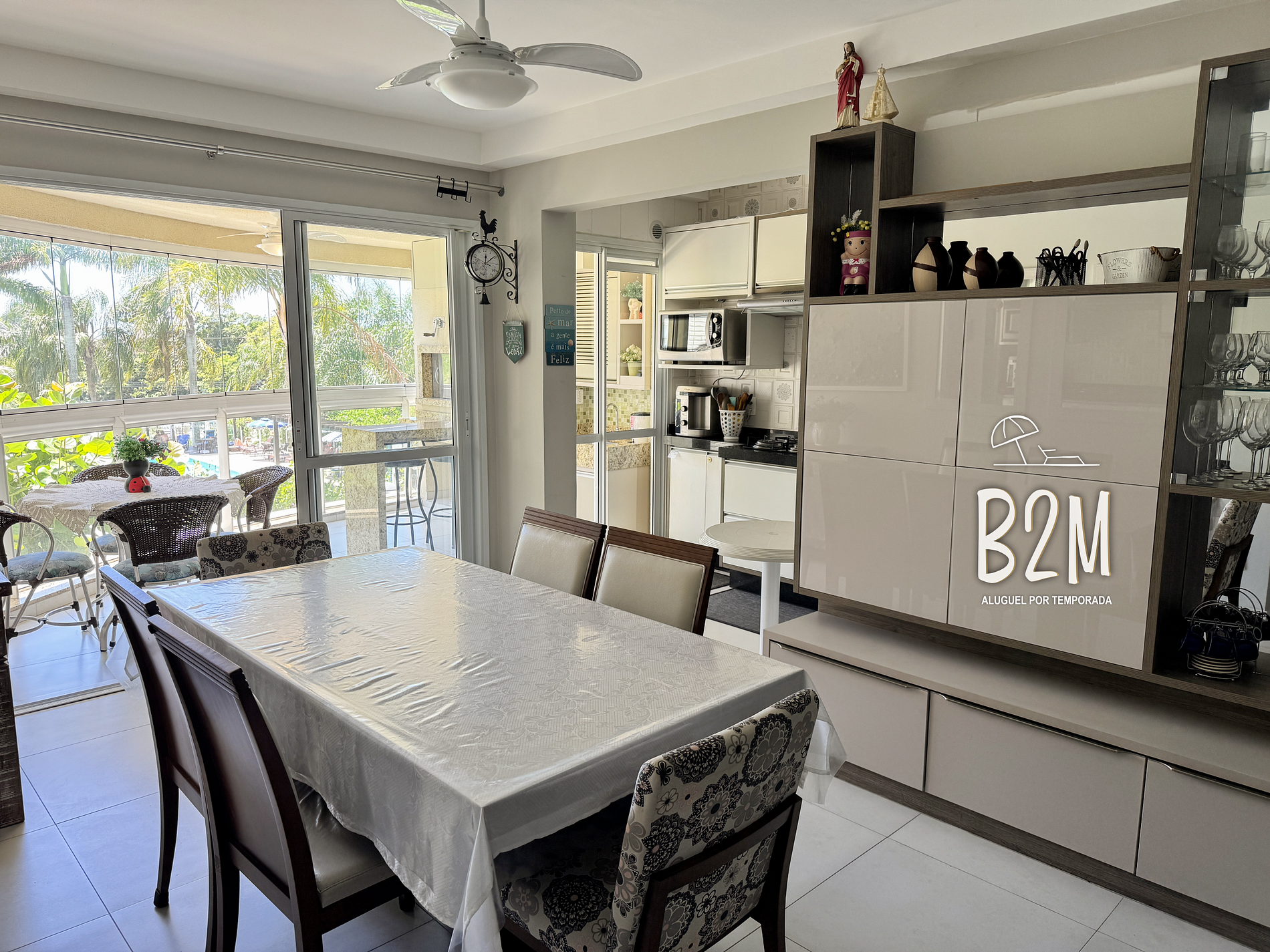 sofá, televisão, internet wifi, mesa de jantar para 6 pessoas, cristaleira, ventilador