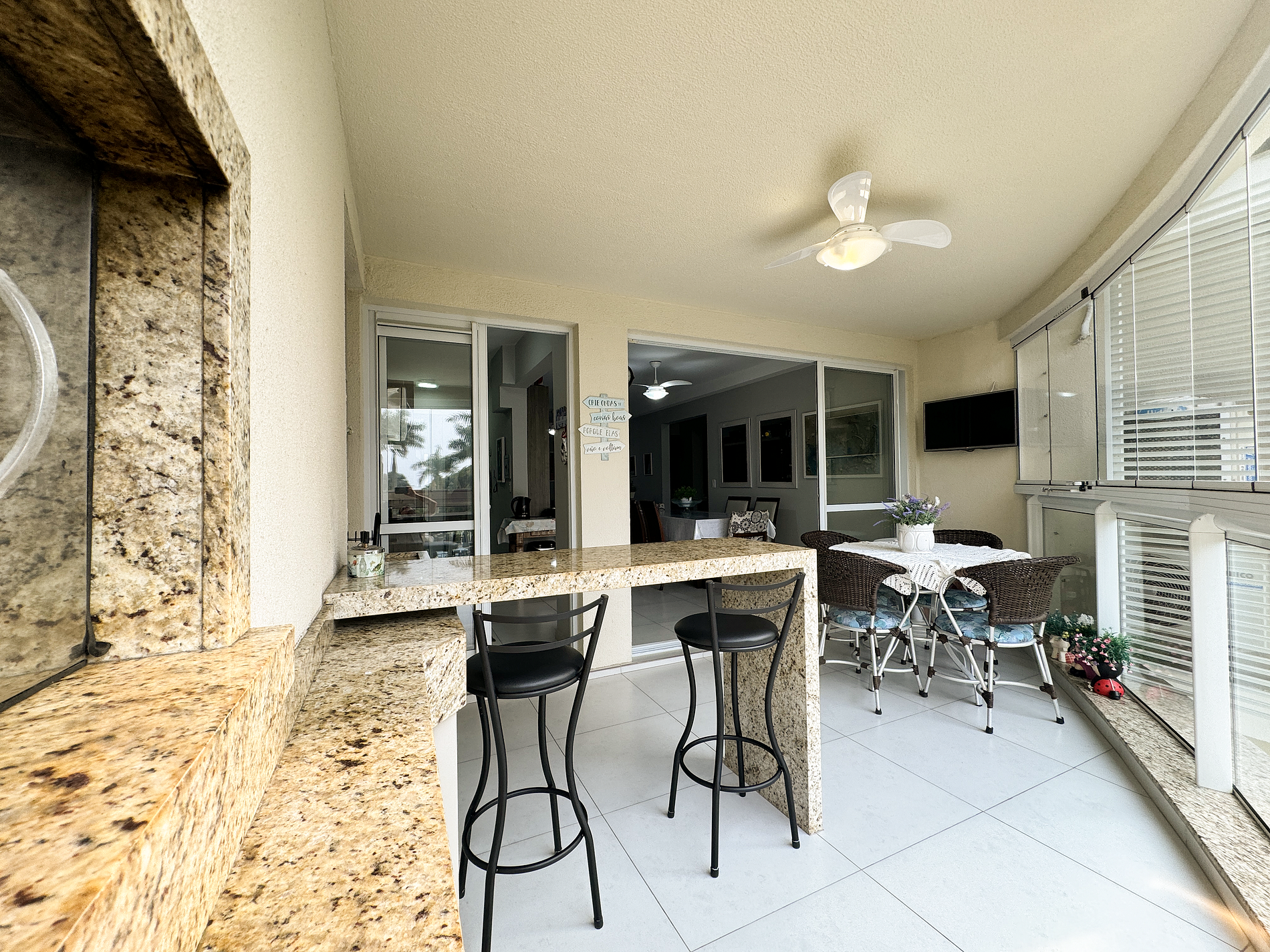 churrasqueira, mesa com 4 cadeiras, bancada com 2 cadeiras altas, armário, pia