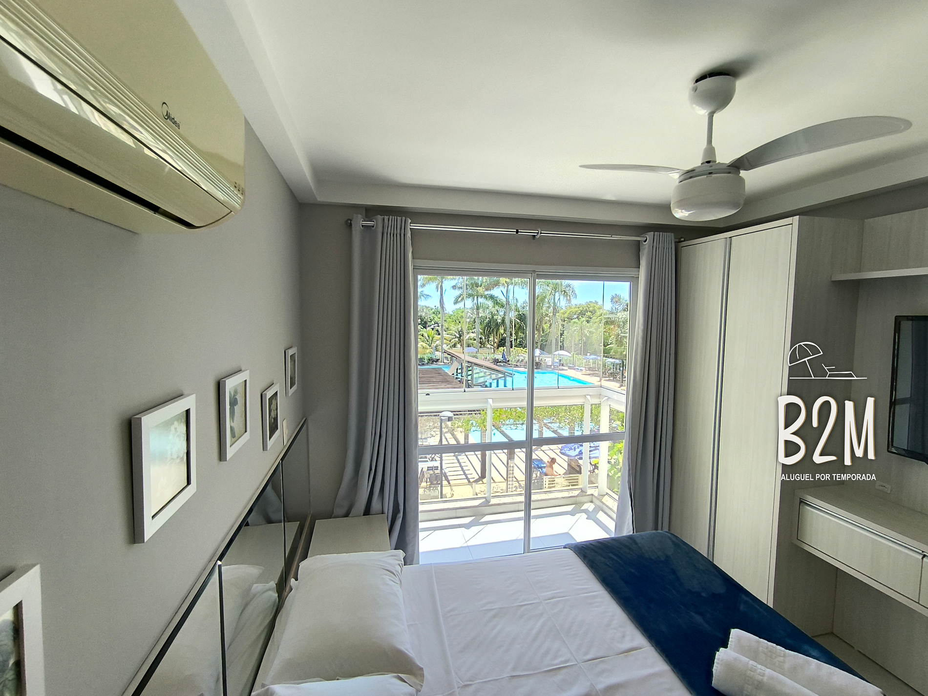 varanda com vista da piscina, cama queen, ar condicionado, ventilador, armário, banheiro privativo com água quente