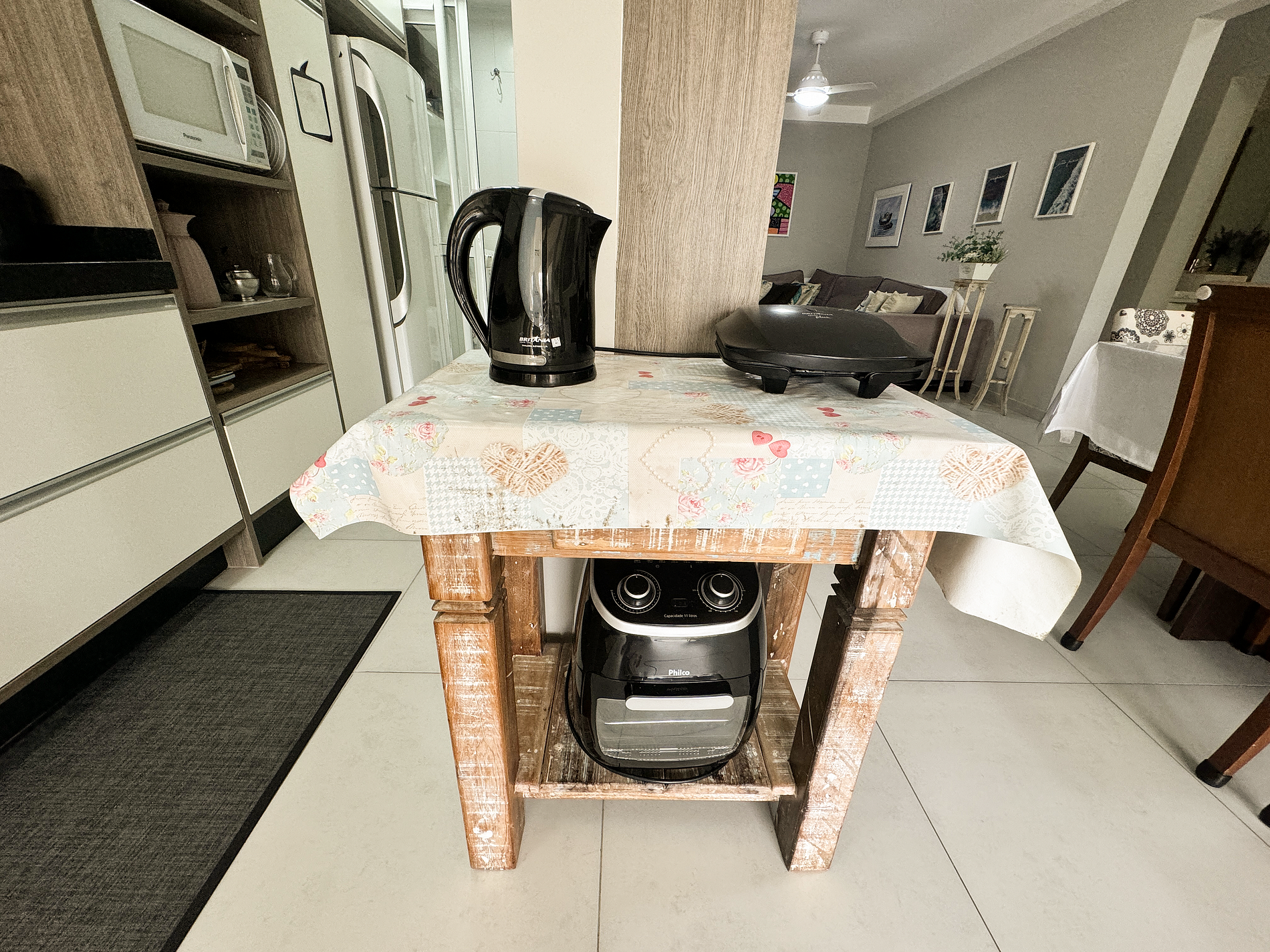 geladeira, bebedouro, microondas, fogão, forno elétrico, airfryer, sanduicheira, cafeteira, liquidificador, panelas, talheres e utensílios para o preparado de refeições