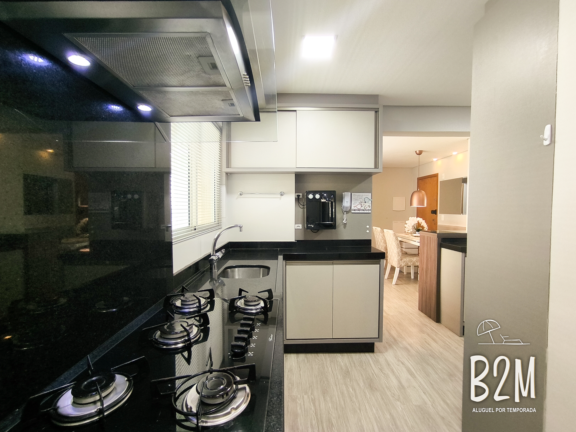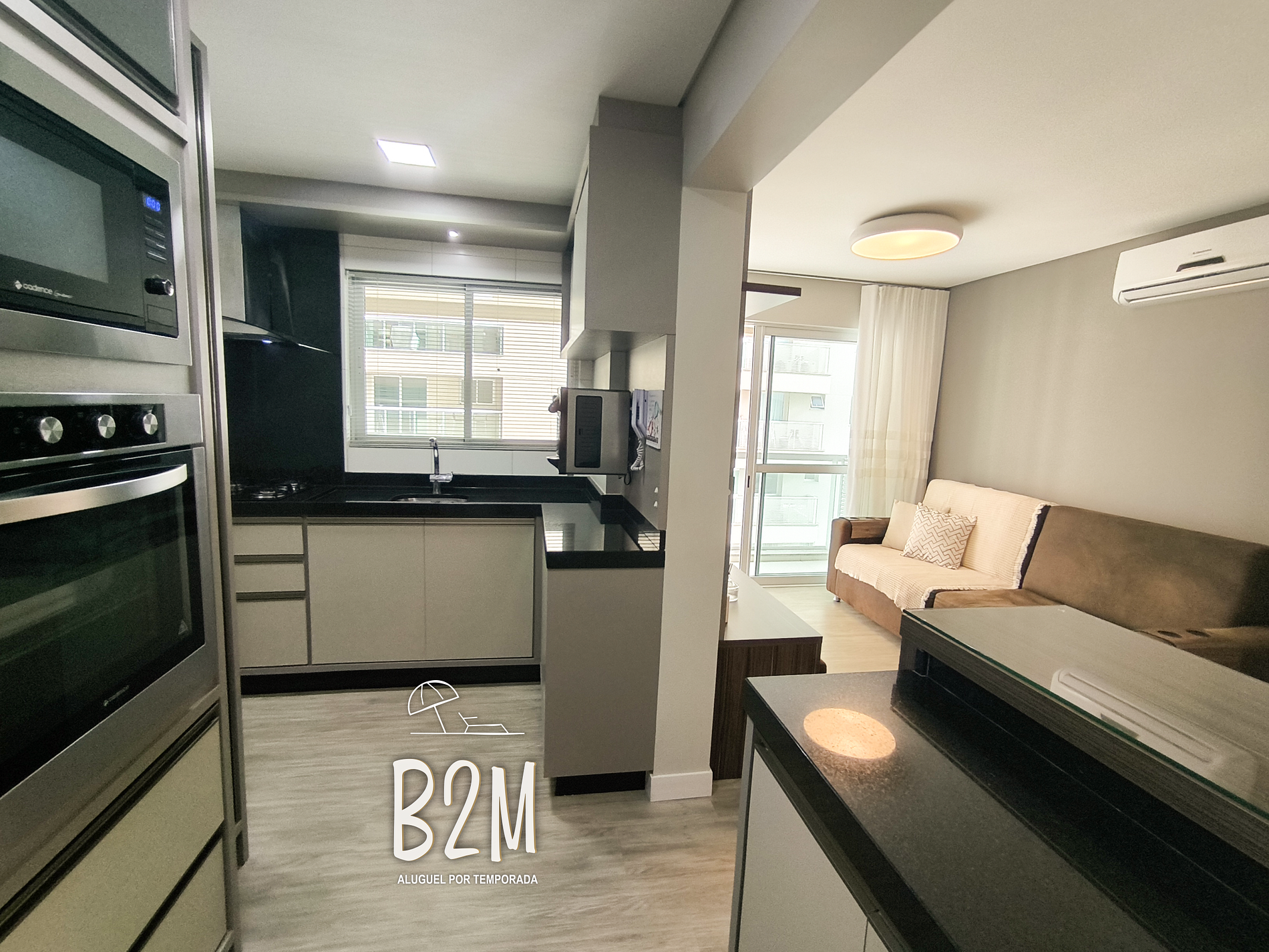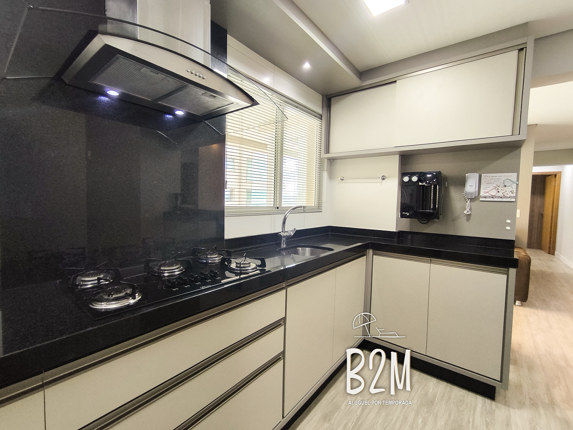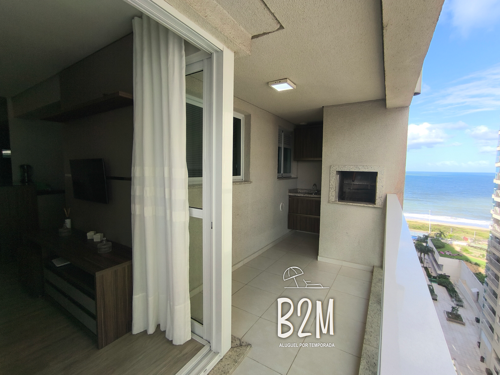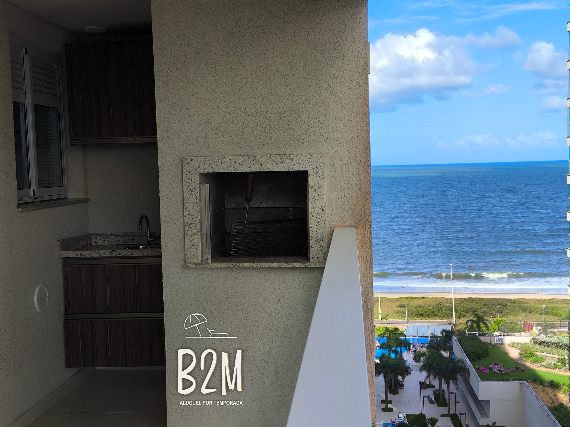 O apartamento possui 2 quartos, sendo 1 suíte. Cozinha completa e uma varanda com churrasqueira e vista para o mar