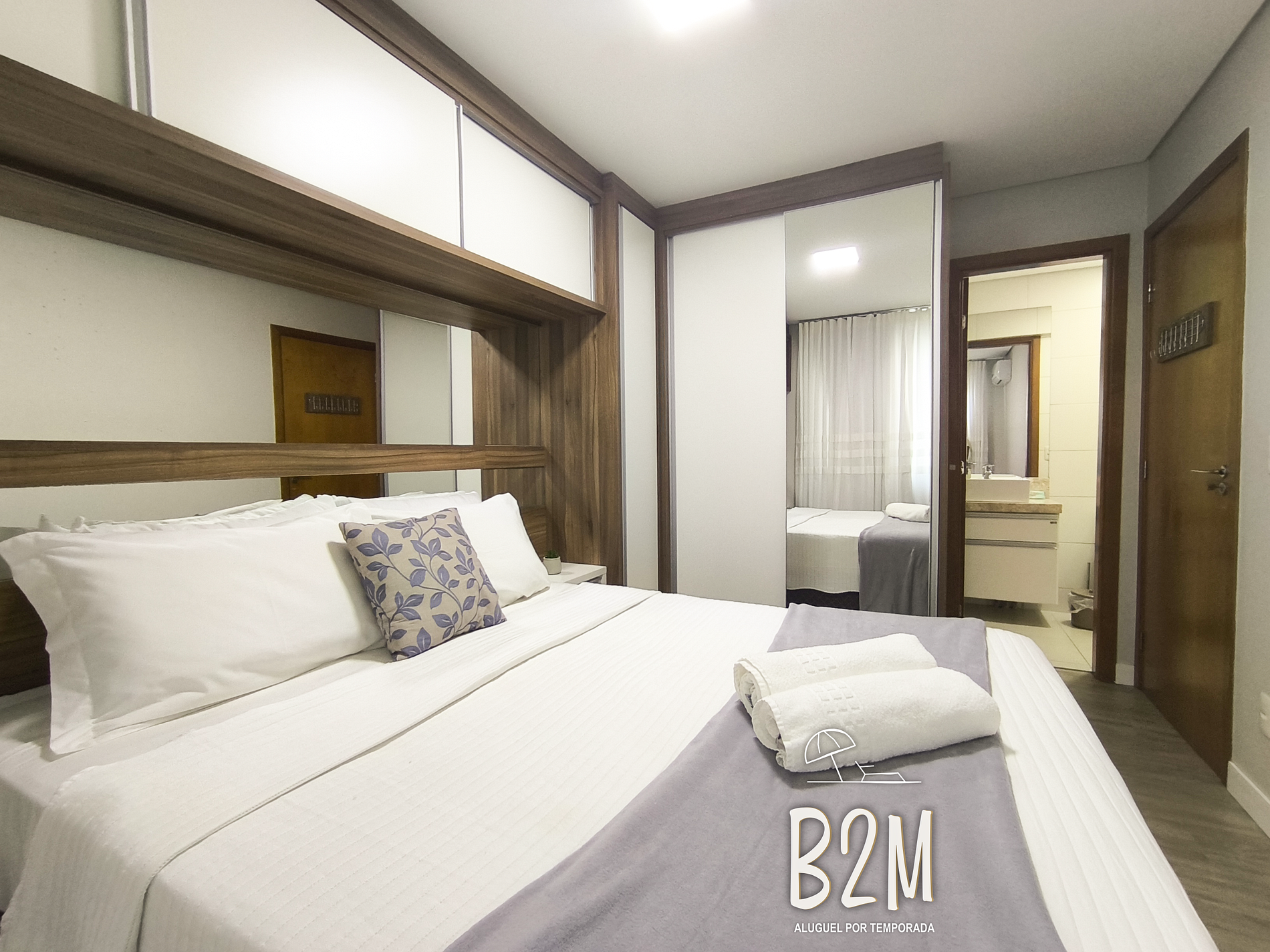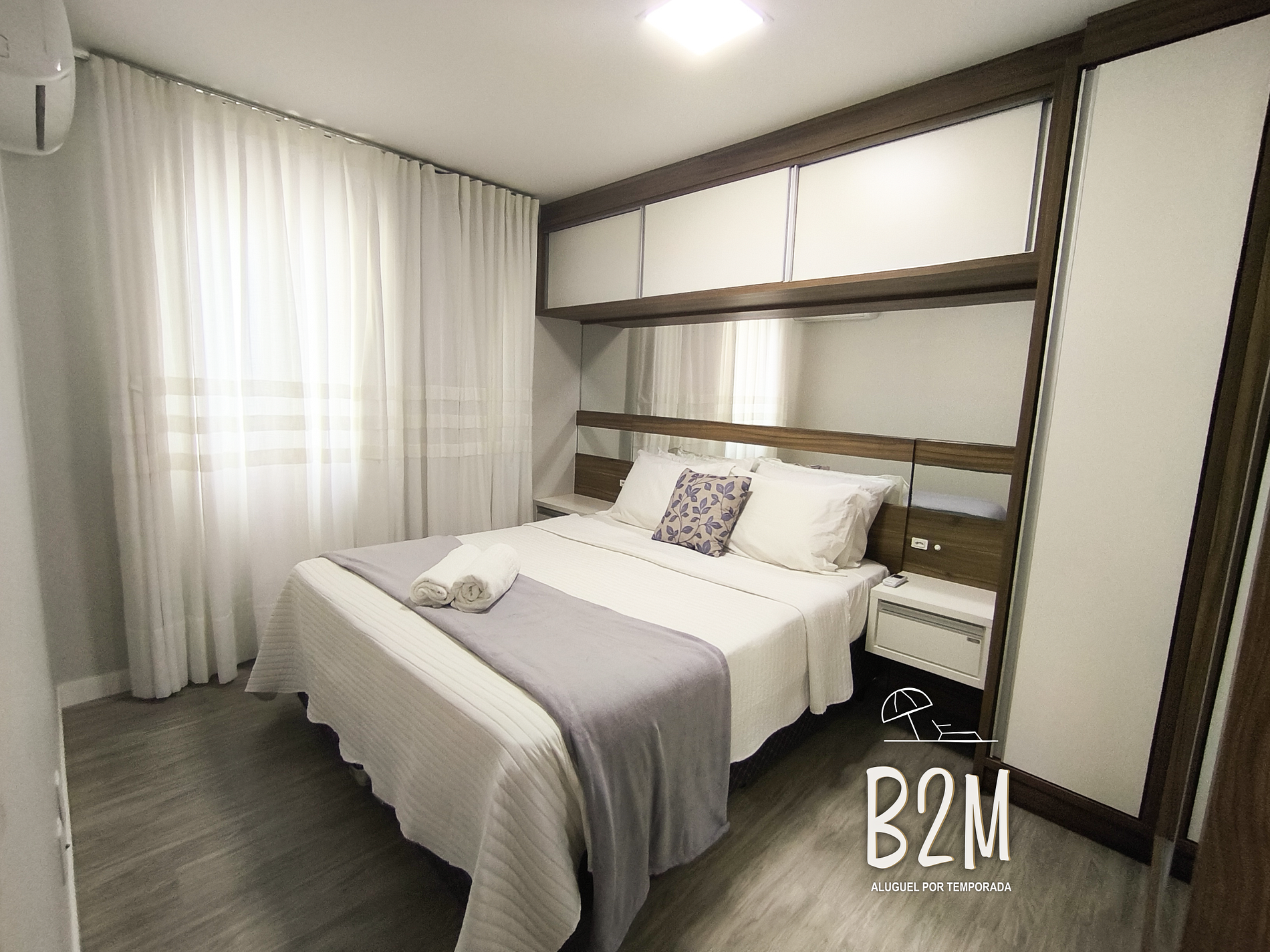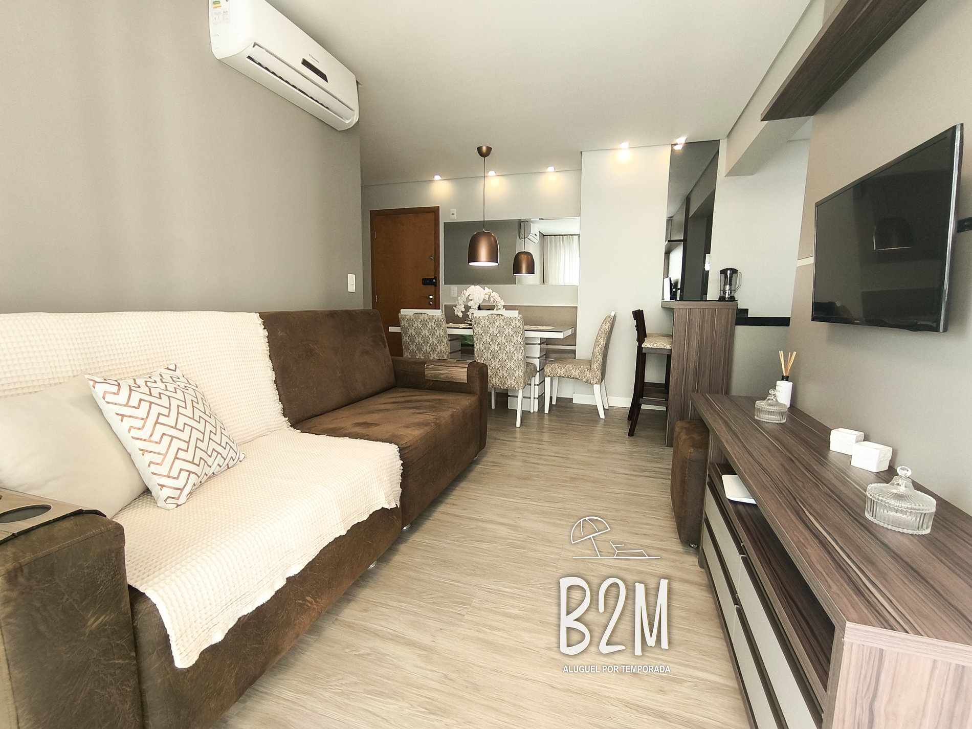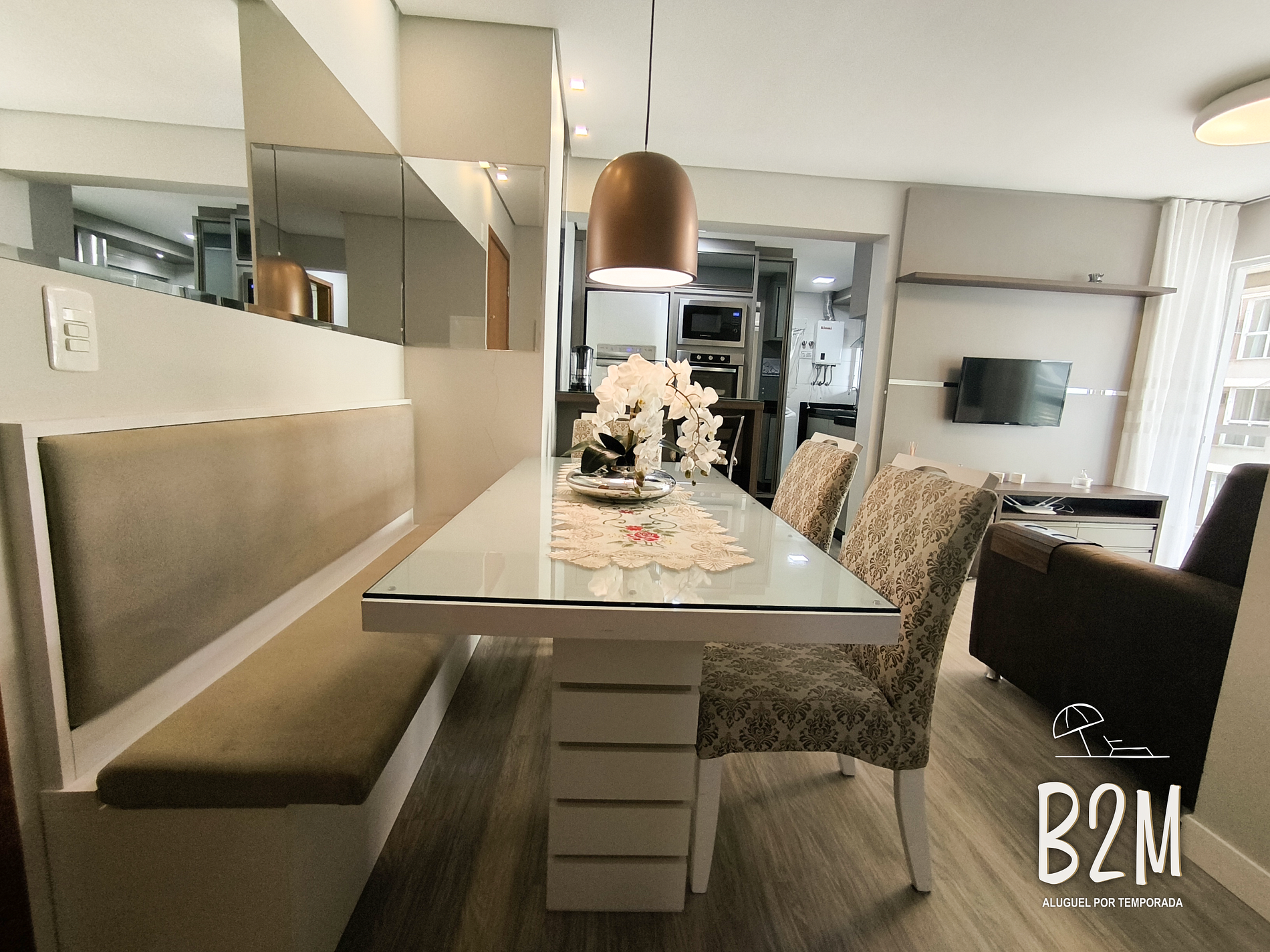 O apartamento possui 2 quartos, sendo 1 suíte. Cozinha completa e uma varanda com churrasqueira e vista para o mar