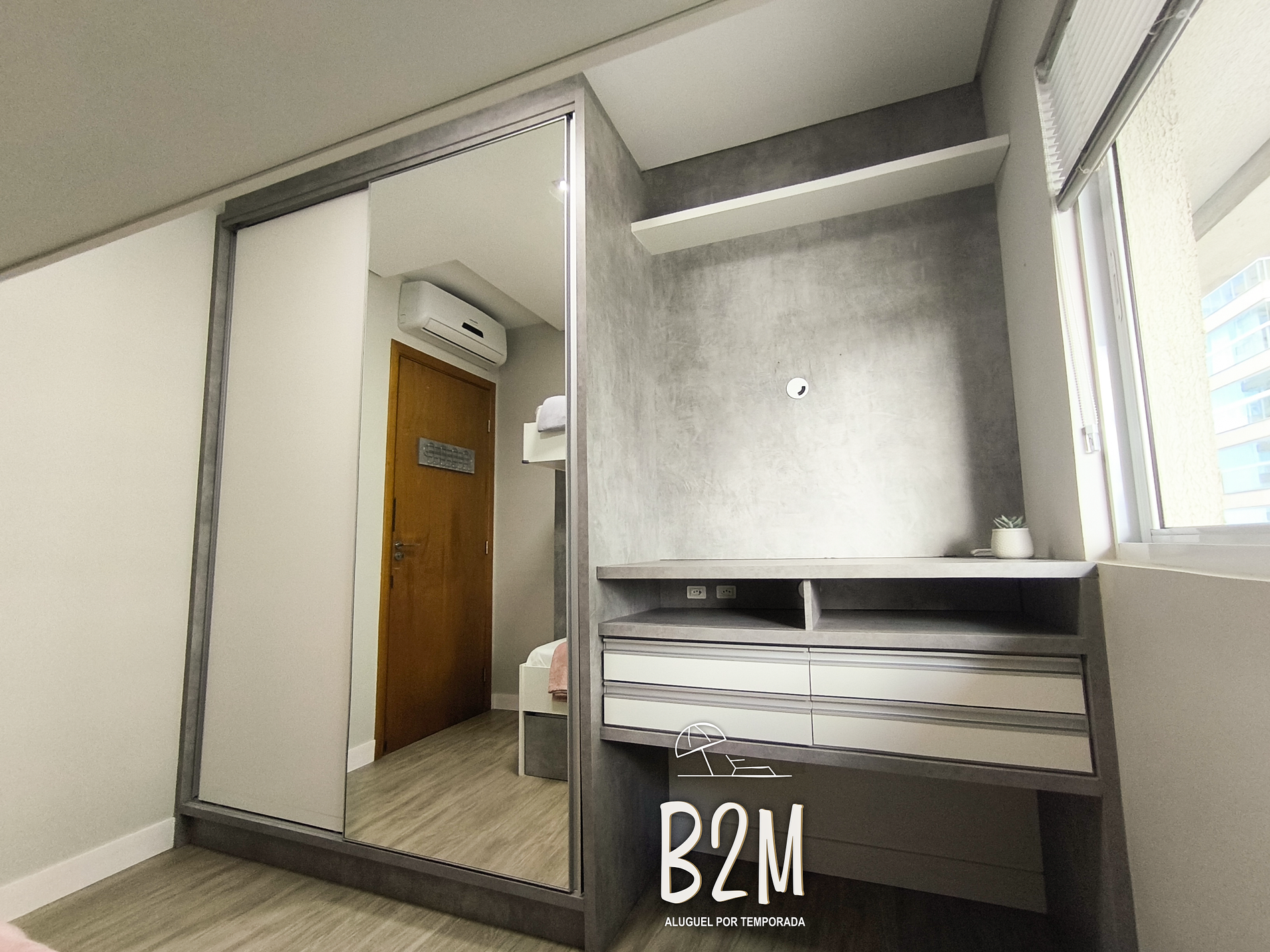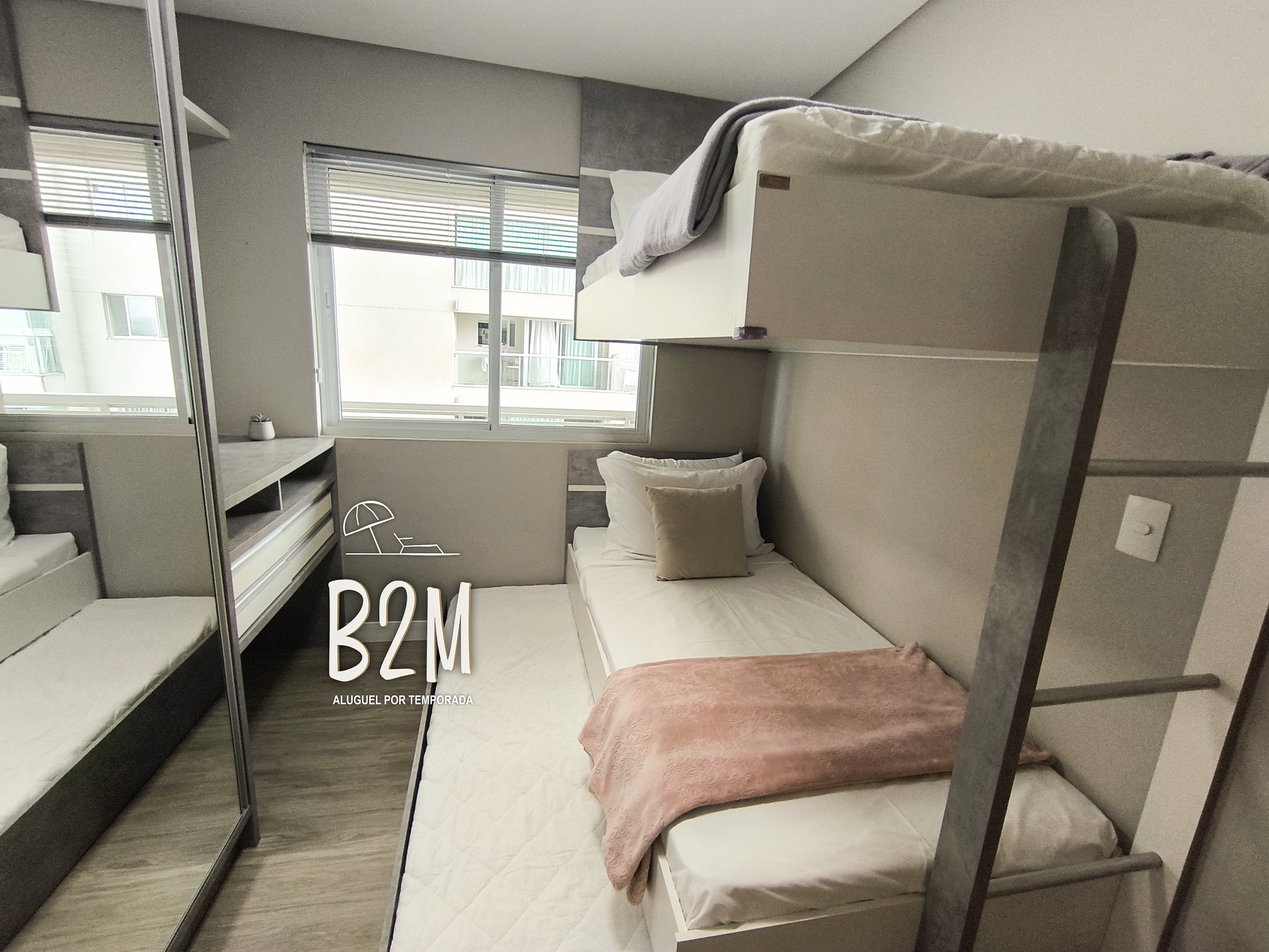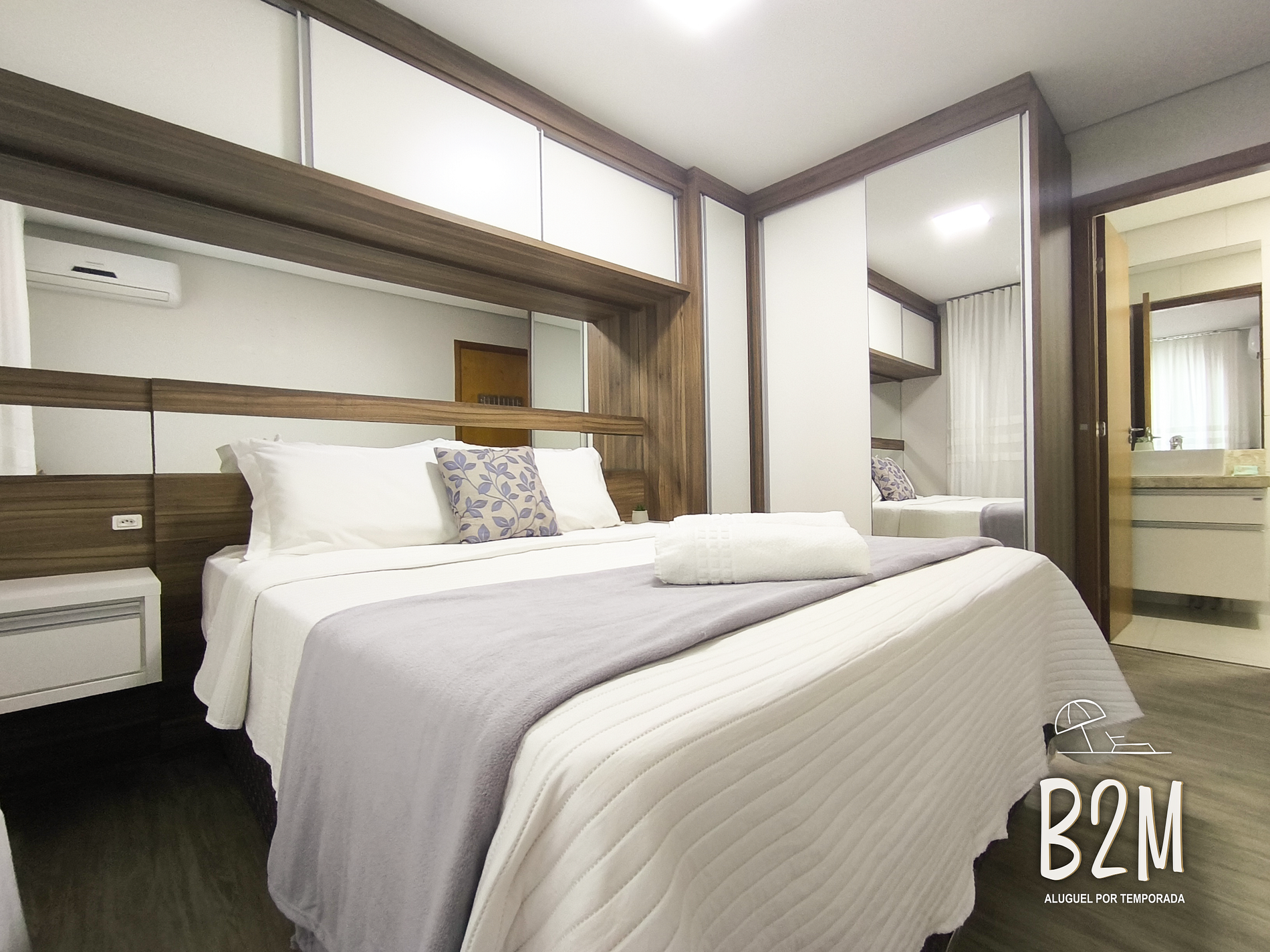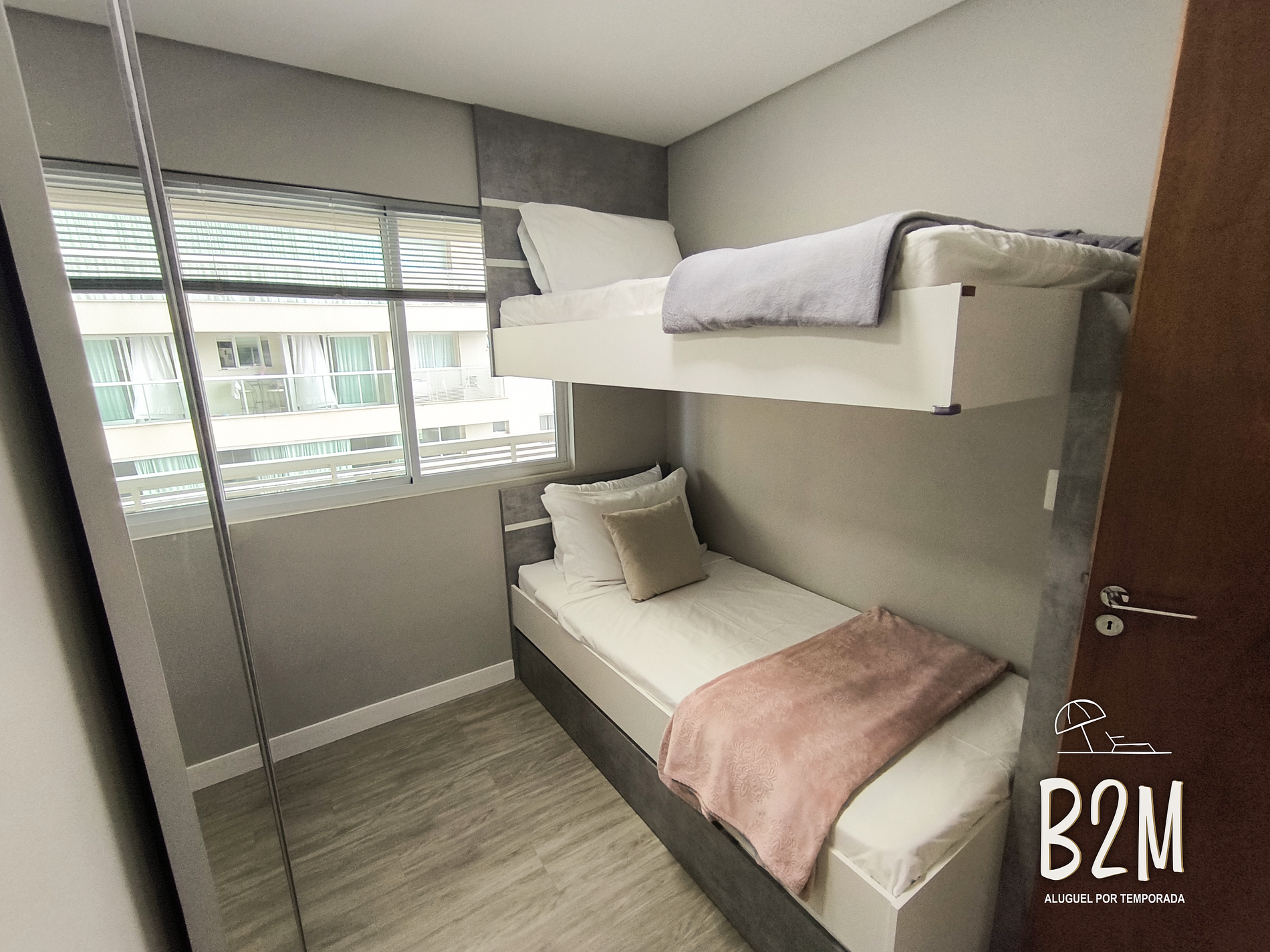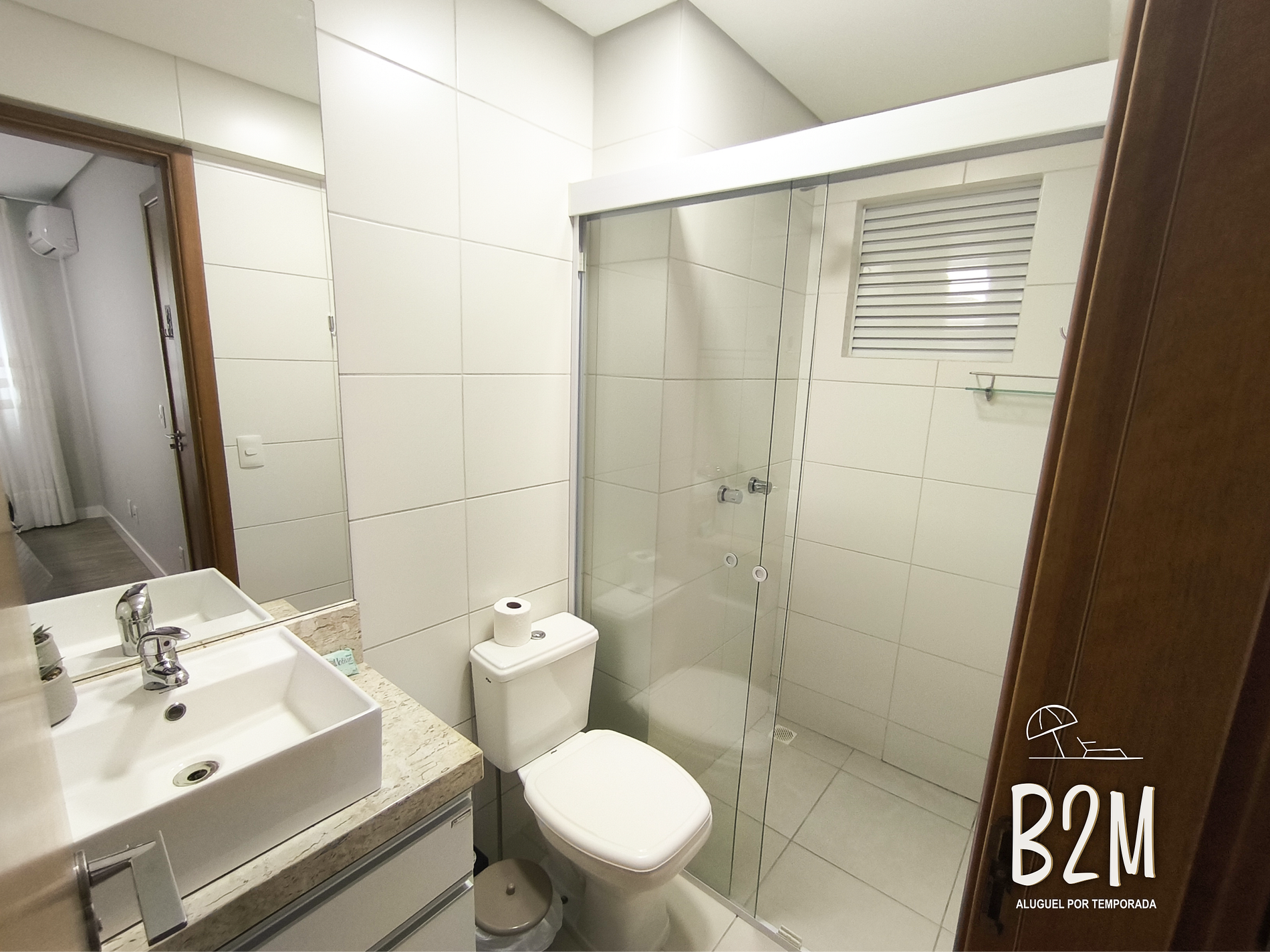 O apartamento possui 2 quartos, sendo 1 suíte. Cozinha completa e uma varanda com churrasqueira e vista para o mar