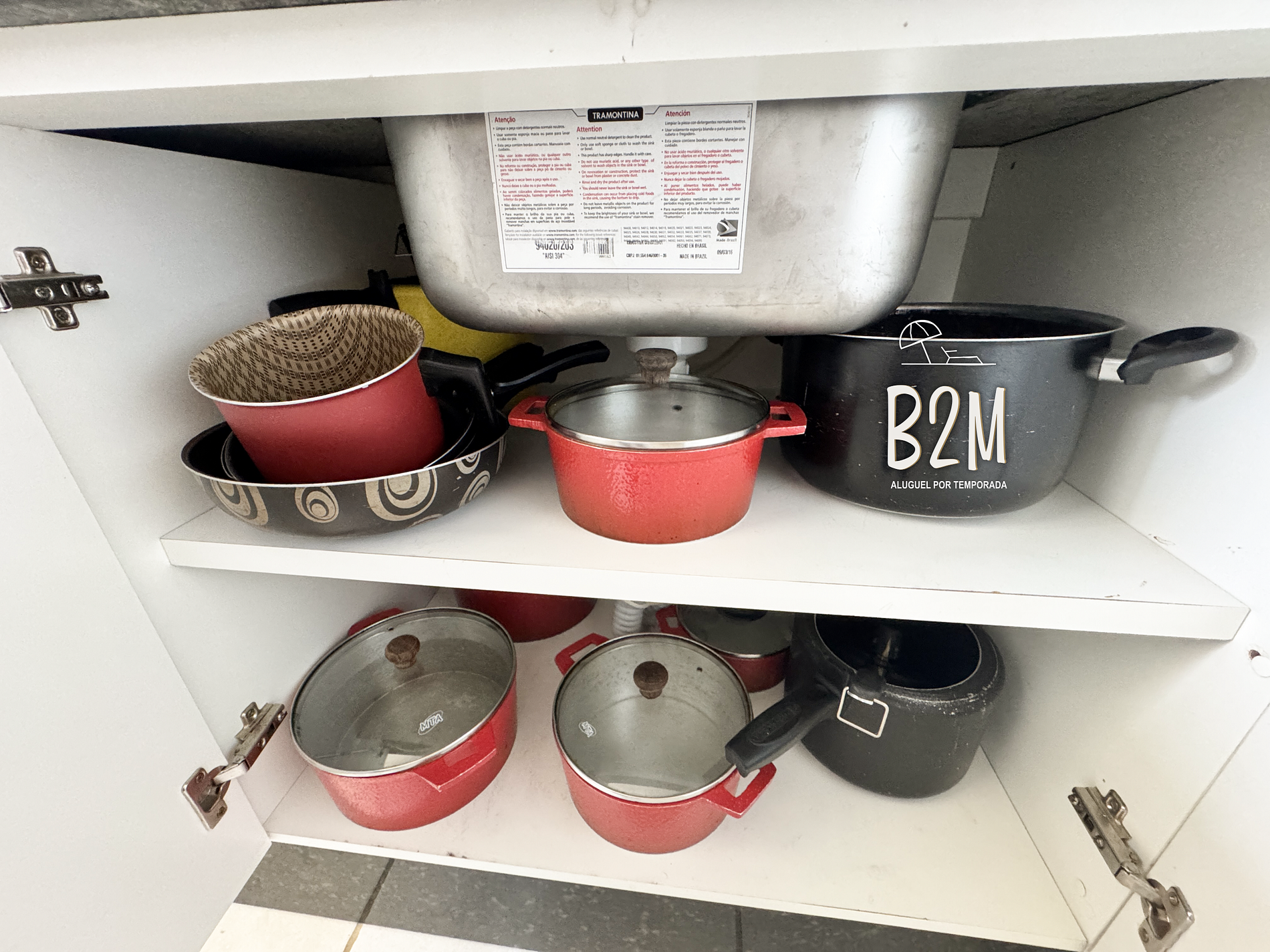 geladeira, microondas, fogão, cafeteira, liquidificador, panelas, talheres e utensílios para o preparado de deliciosas refeições.