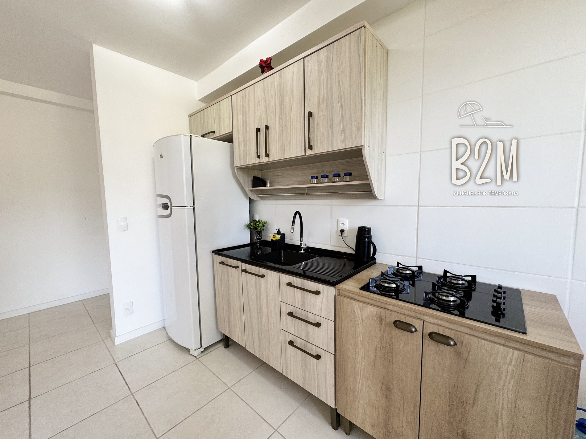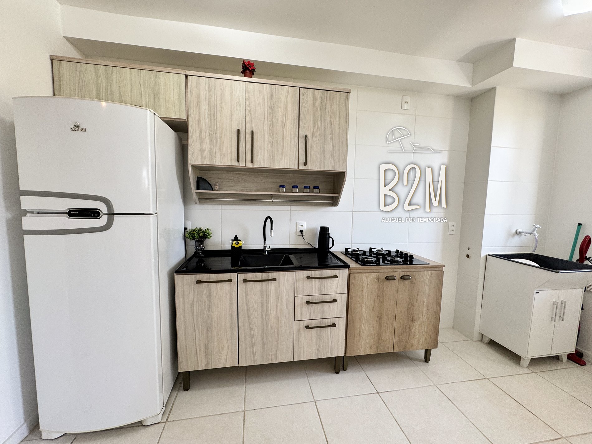geladeira, fogão, sanduicheira, cafeteira, liquidificador, panelas, talheres e utensílios para o preparado de deliciosas refeições.
