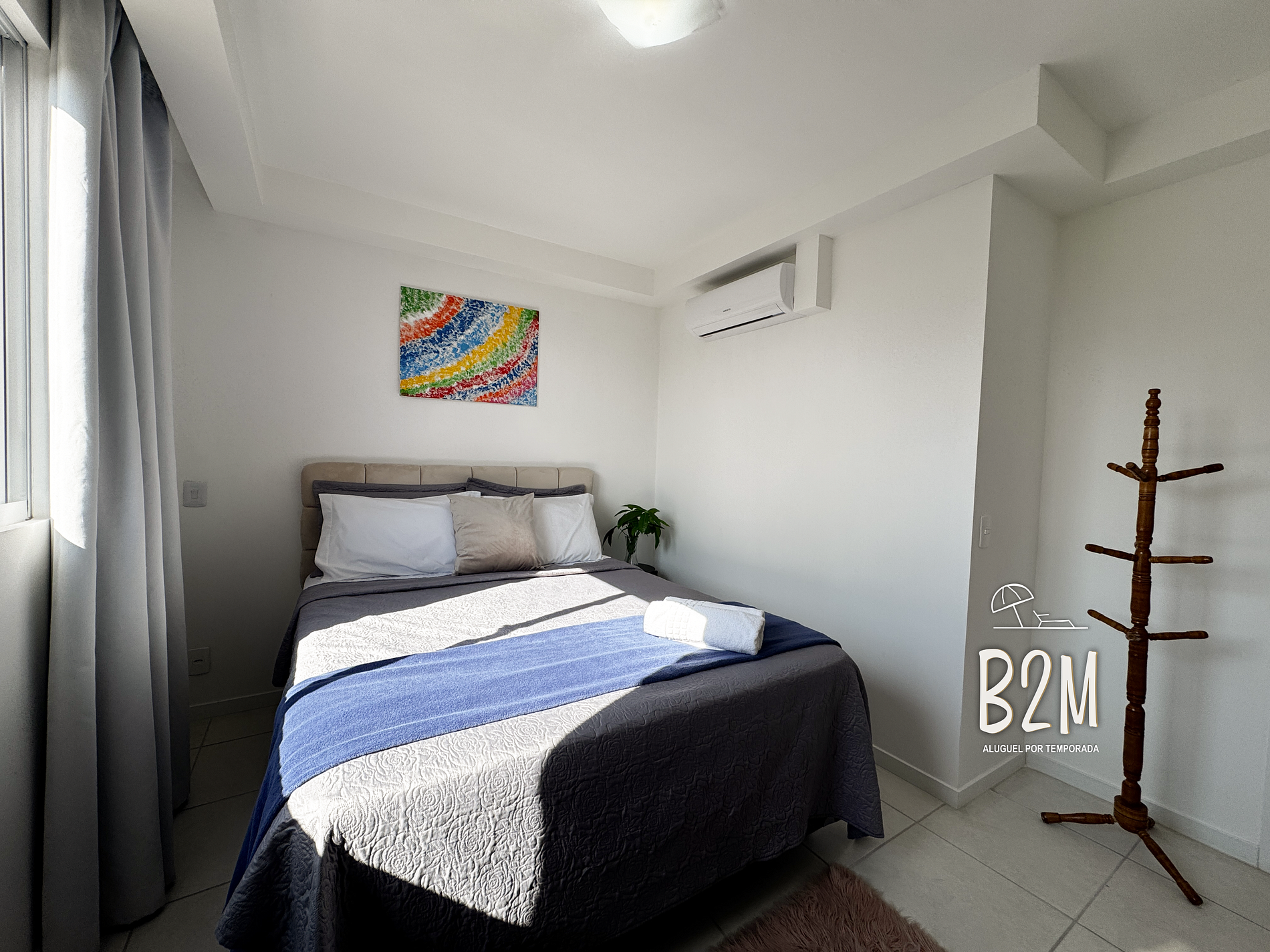 cama de casal, ar condicionado, prateleiras para guardar malas, cortina com blackout, roupa de cama, travesseiro e tolha