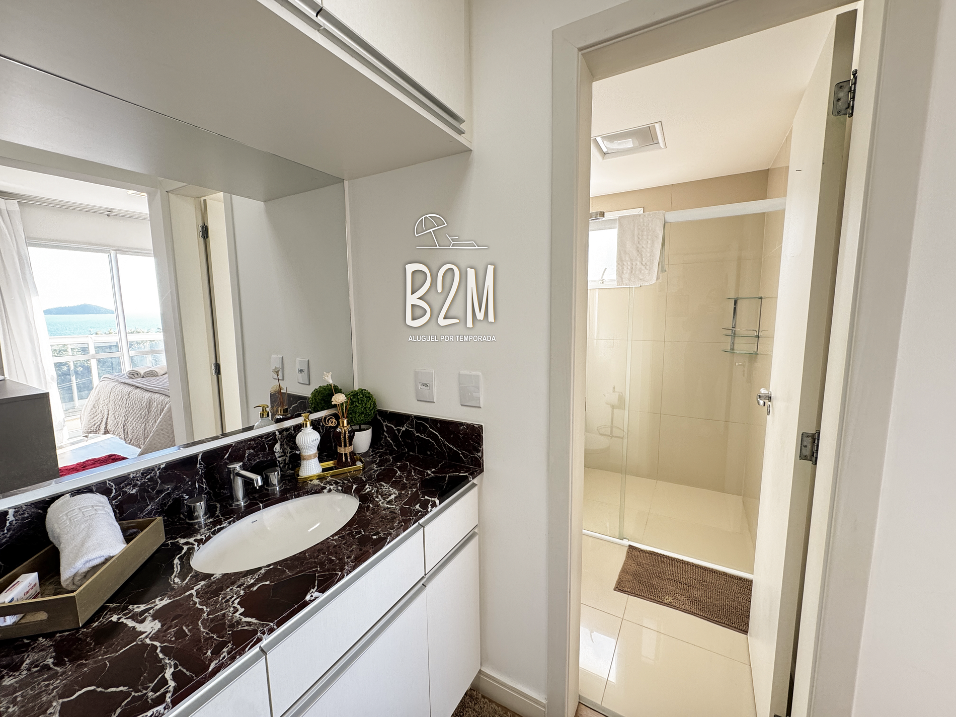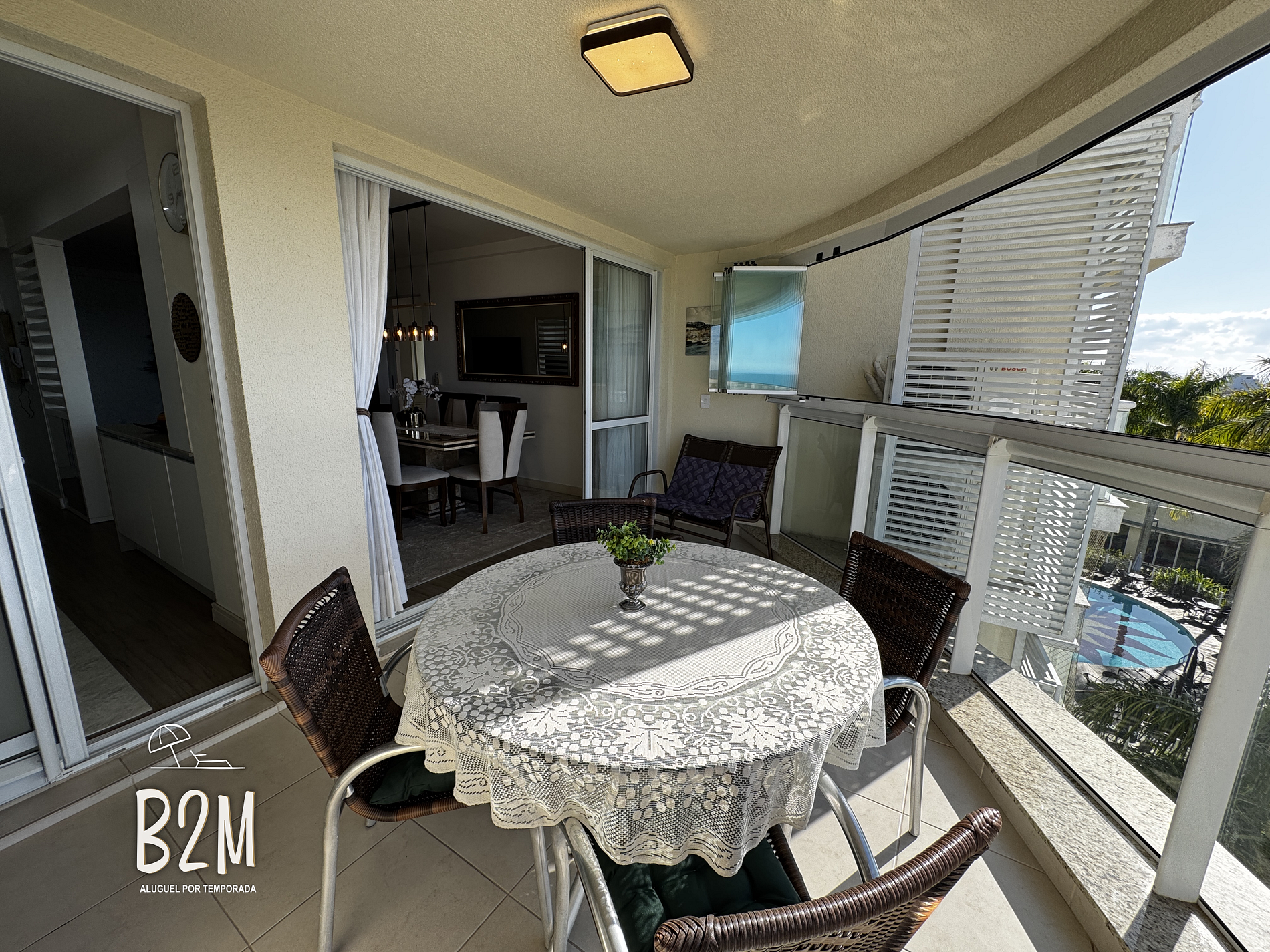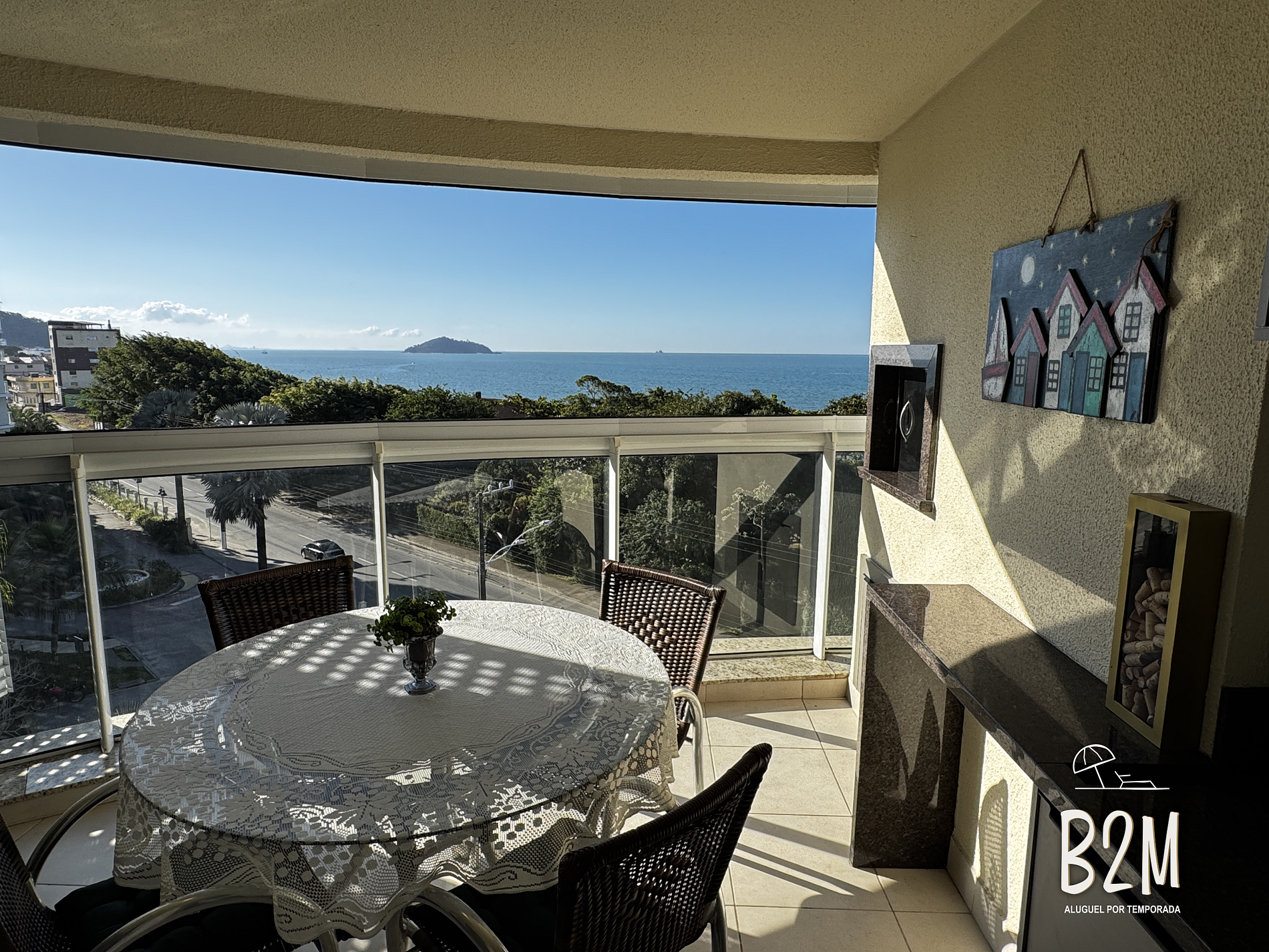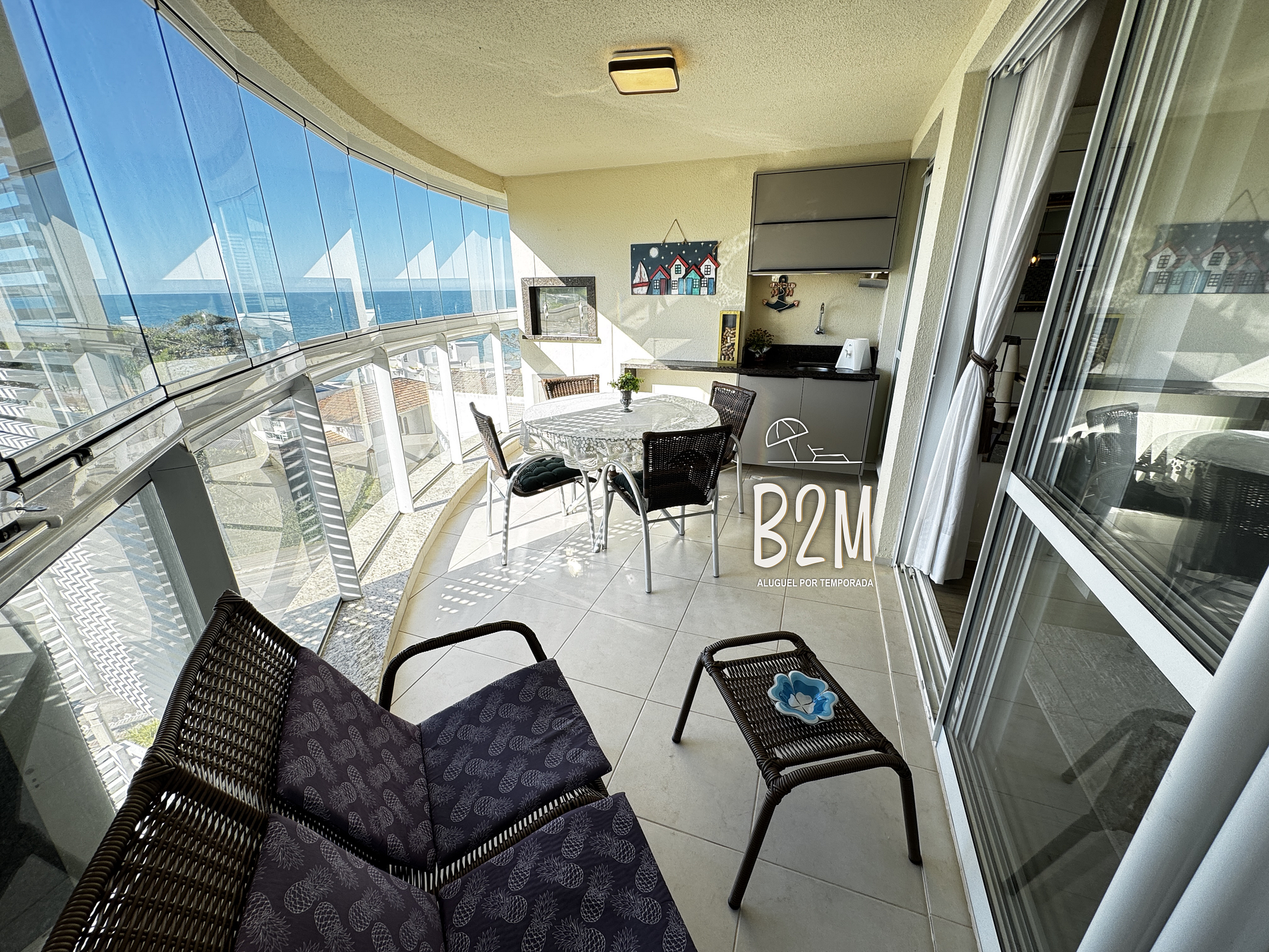 O apartamento possui varanda com churrasqueira e vista para o mar.