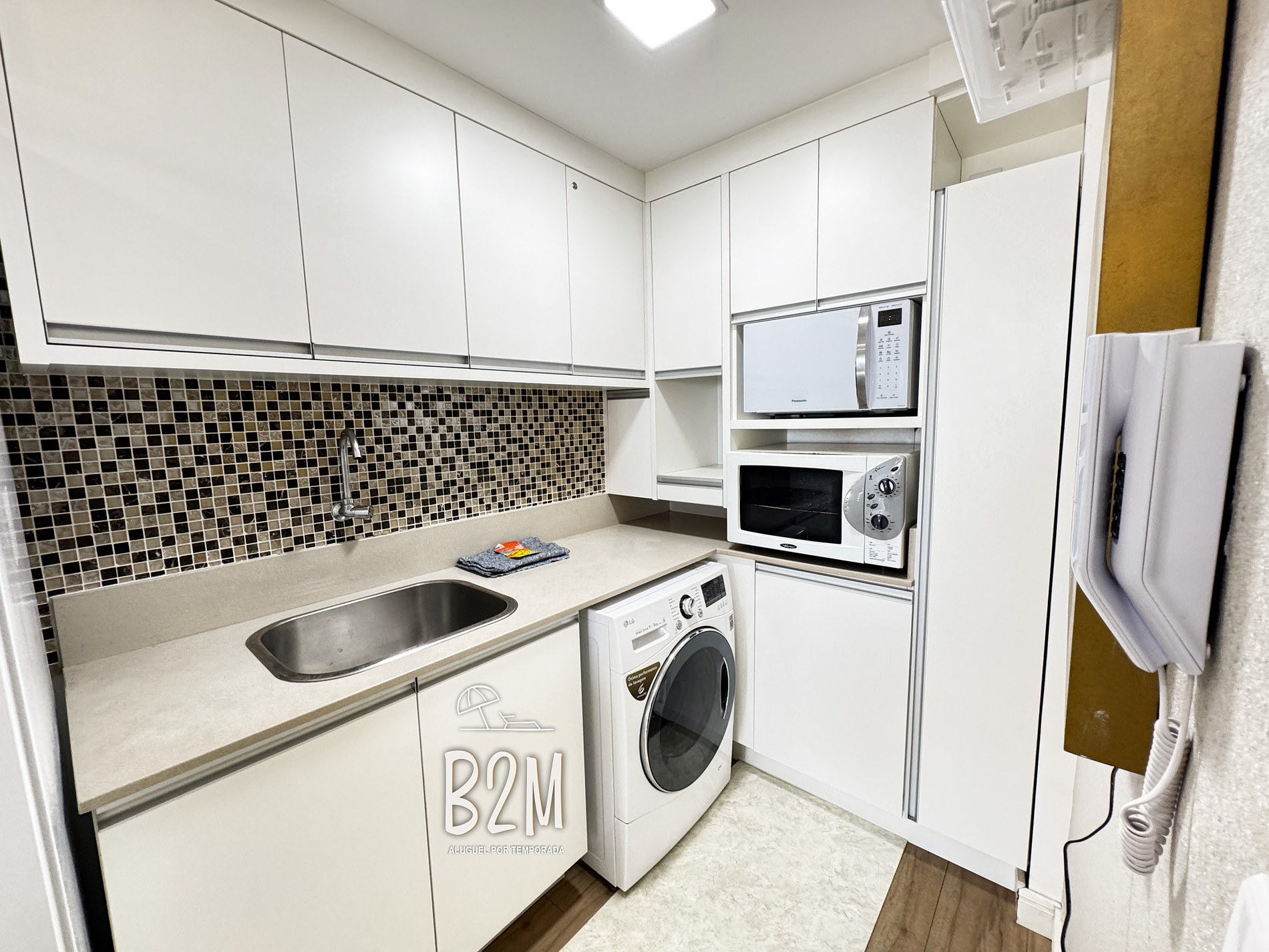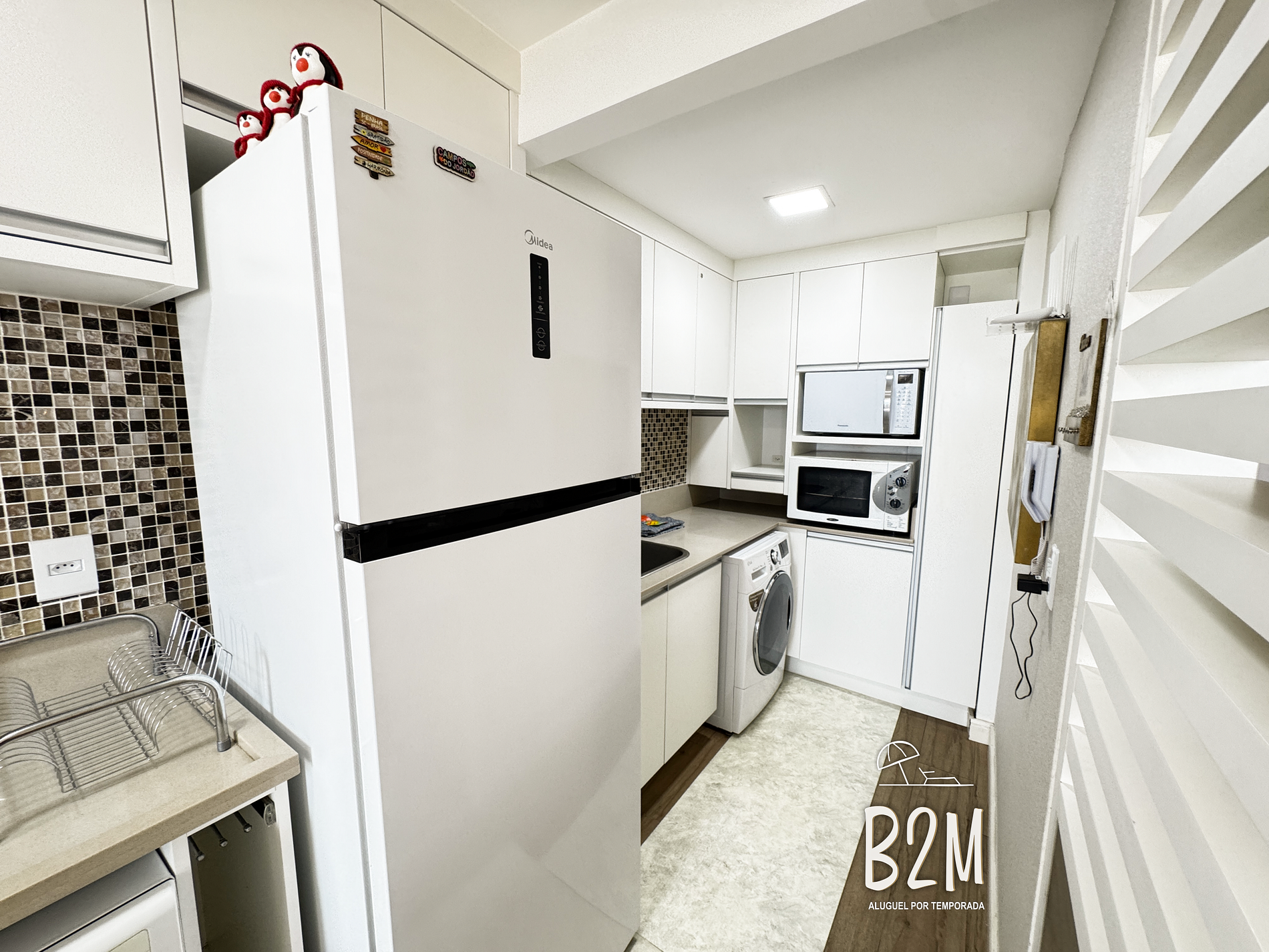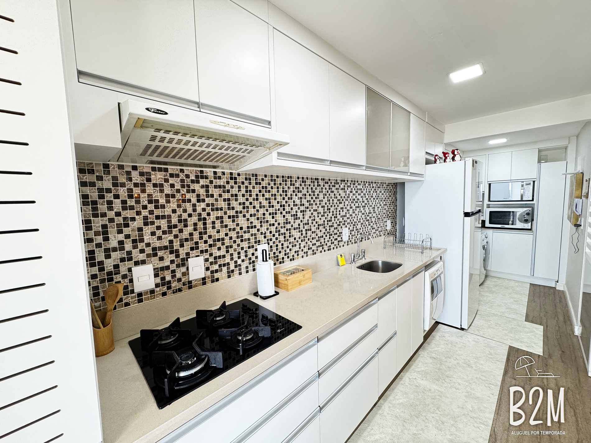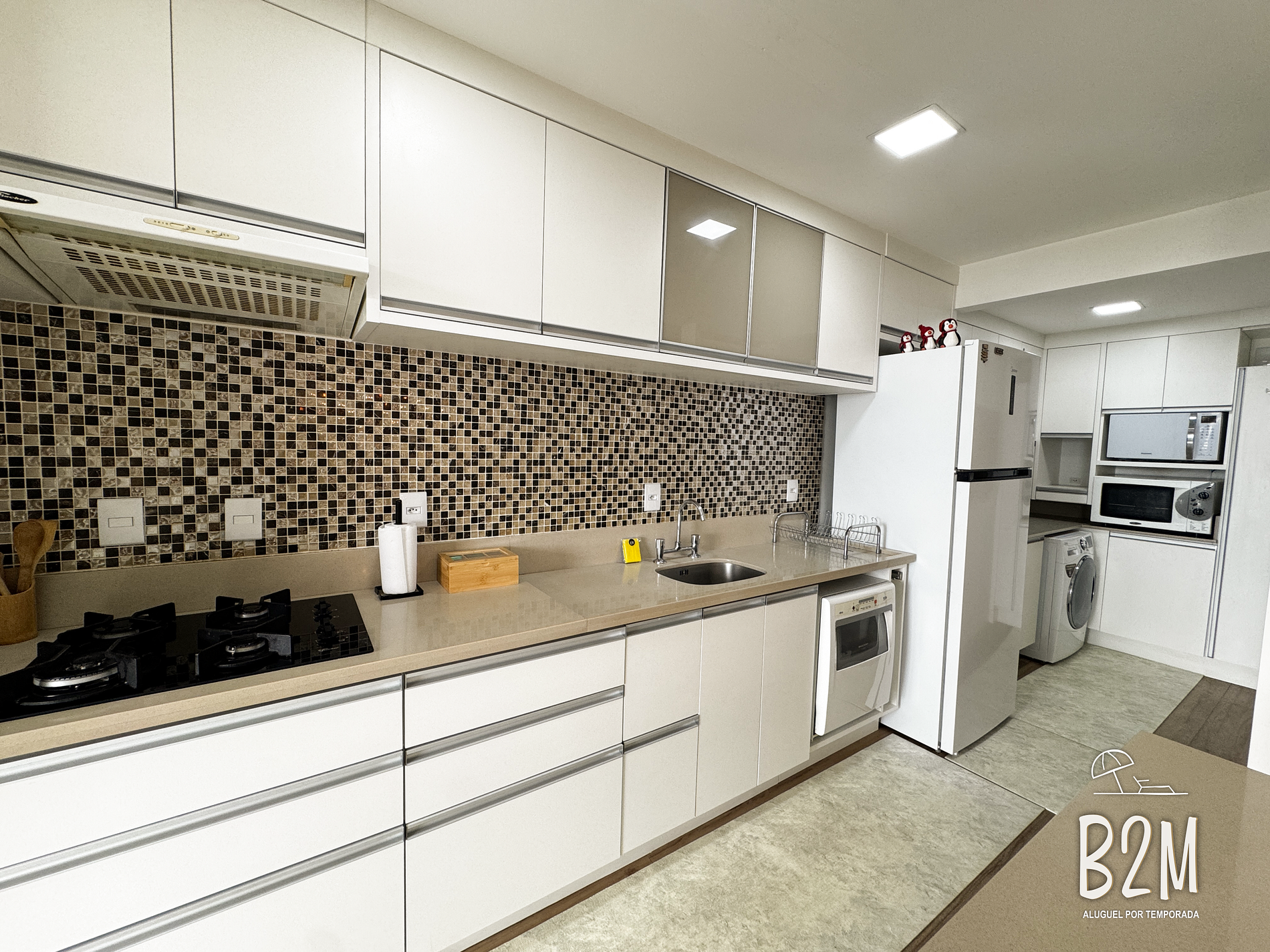 geladeira, microondas, fogão, forno, liquidificador, sanduicheira, cafeteira, chaleira elétrica, torradeira, panelas, lava louças, talheres e utensílios para o preparado de deliciosas refeições.