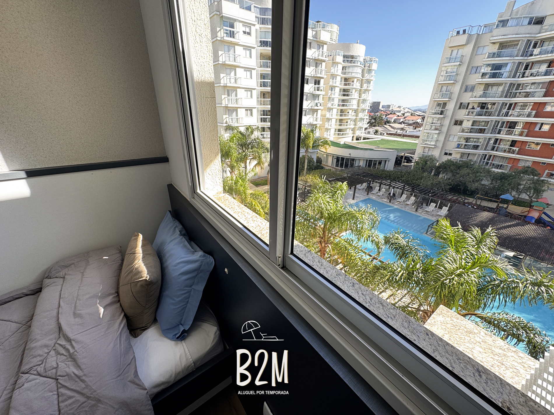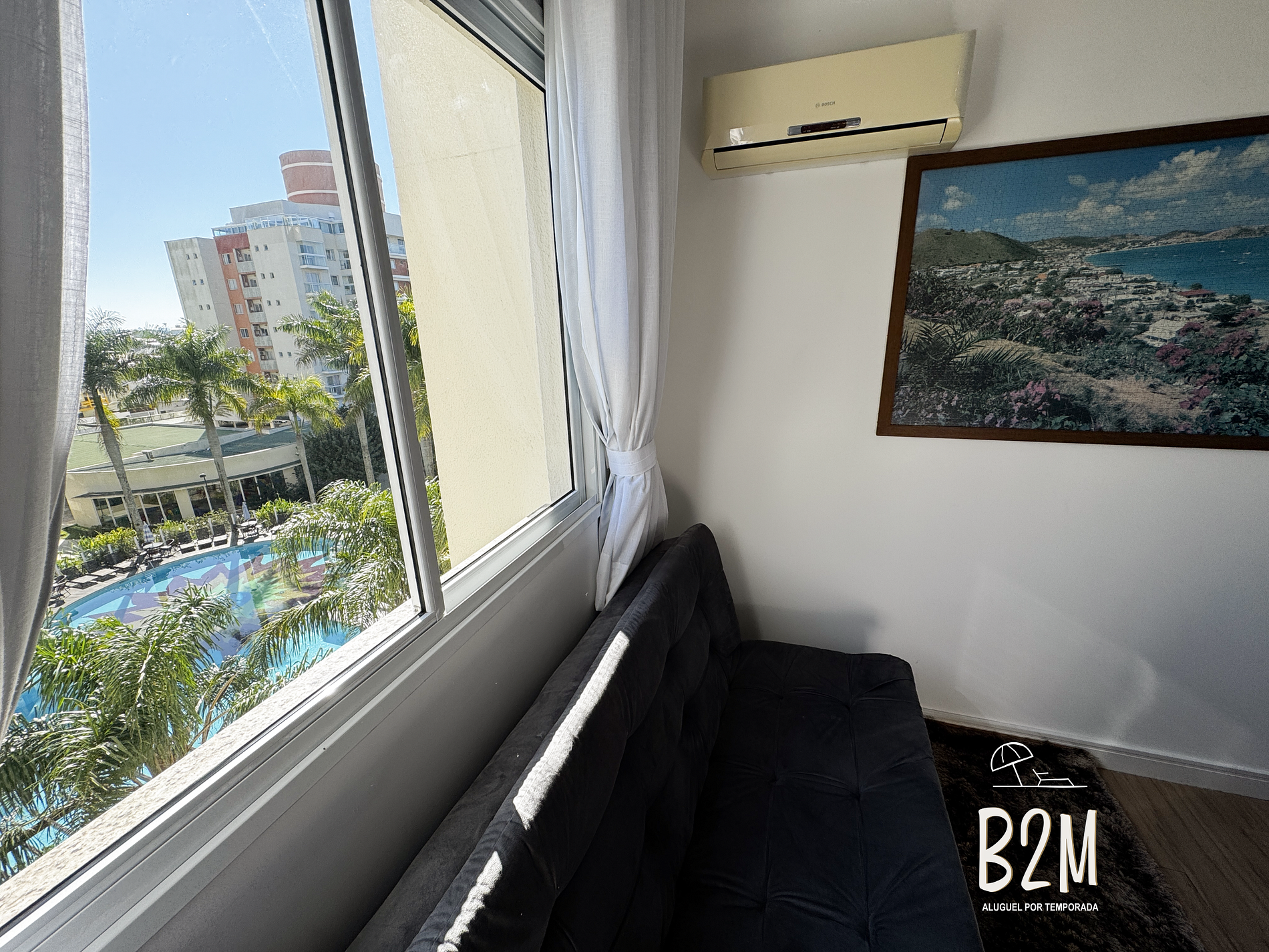 janela com vista da piscina, cama de casal, sofá cama, ar condicionado