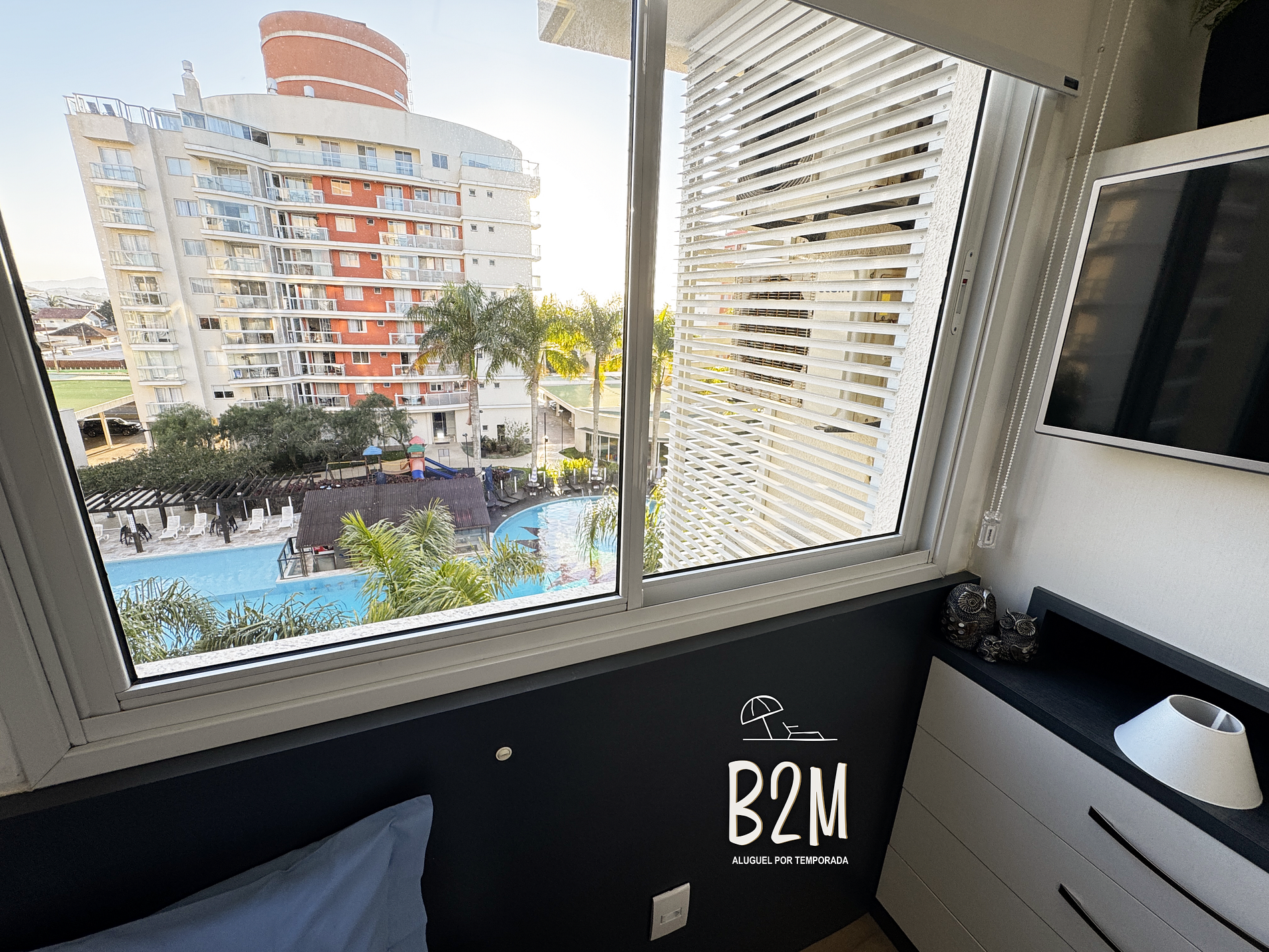 janela com vista da piscina, 2 camas de solteiro, TV, ar condicionado, cômoda
